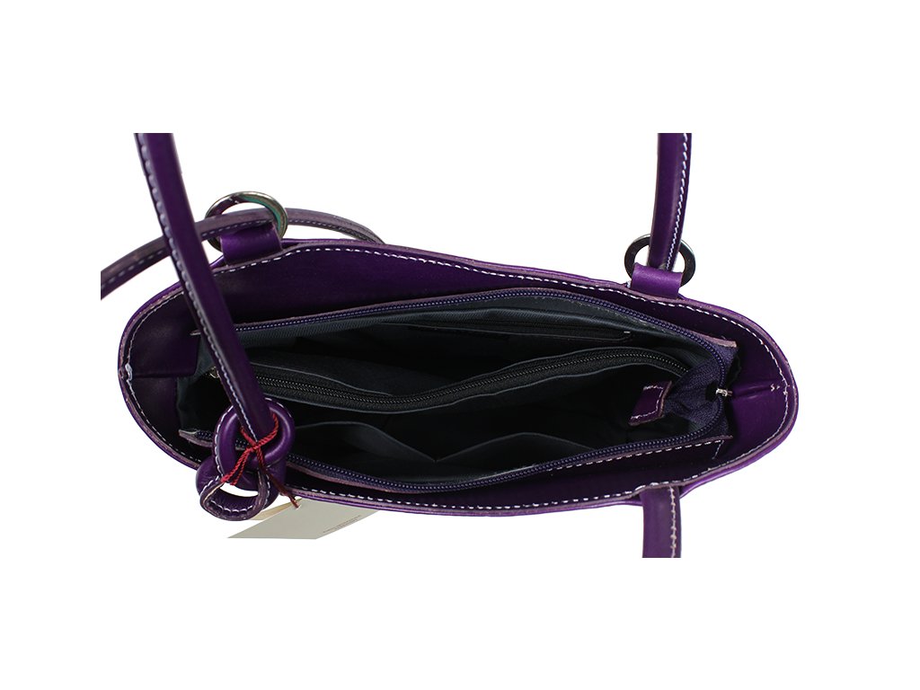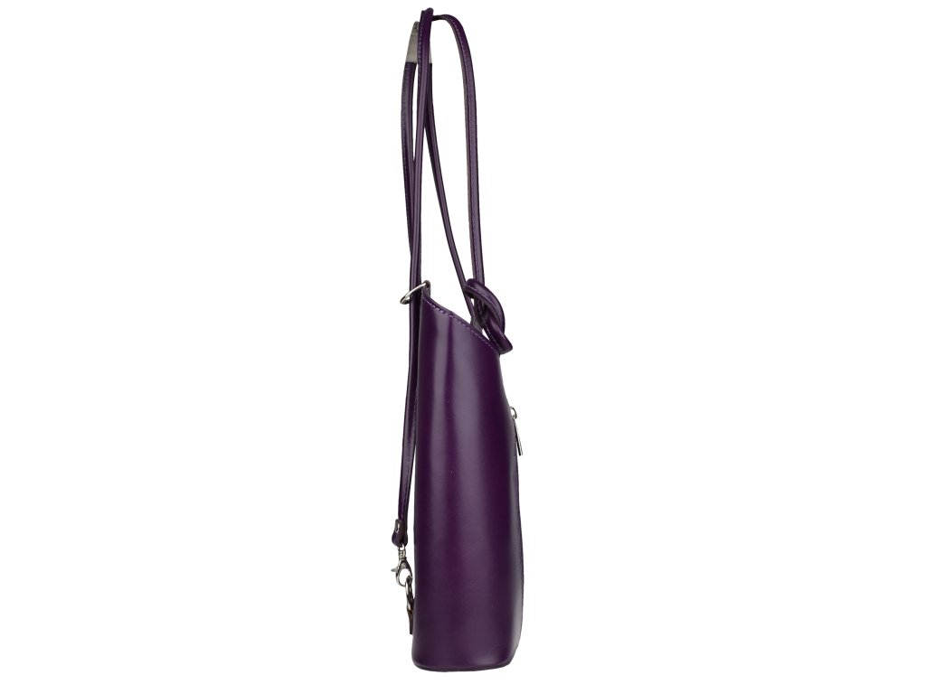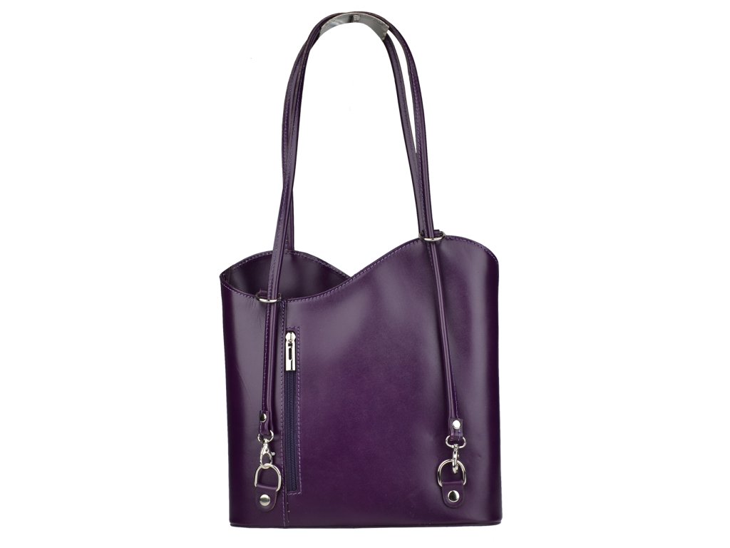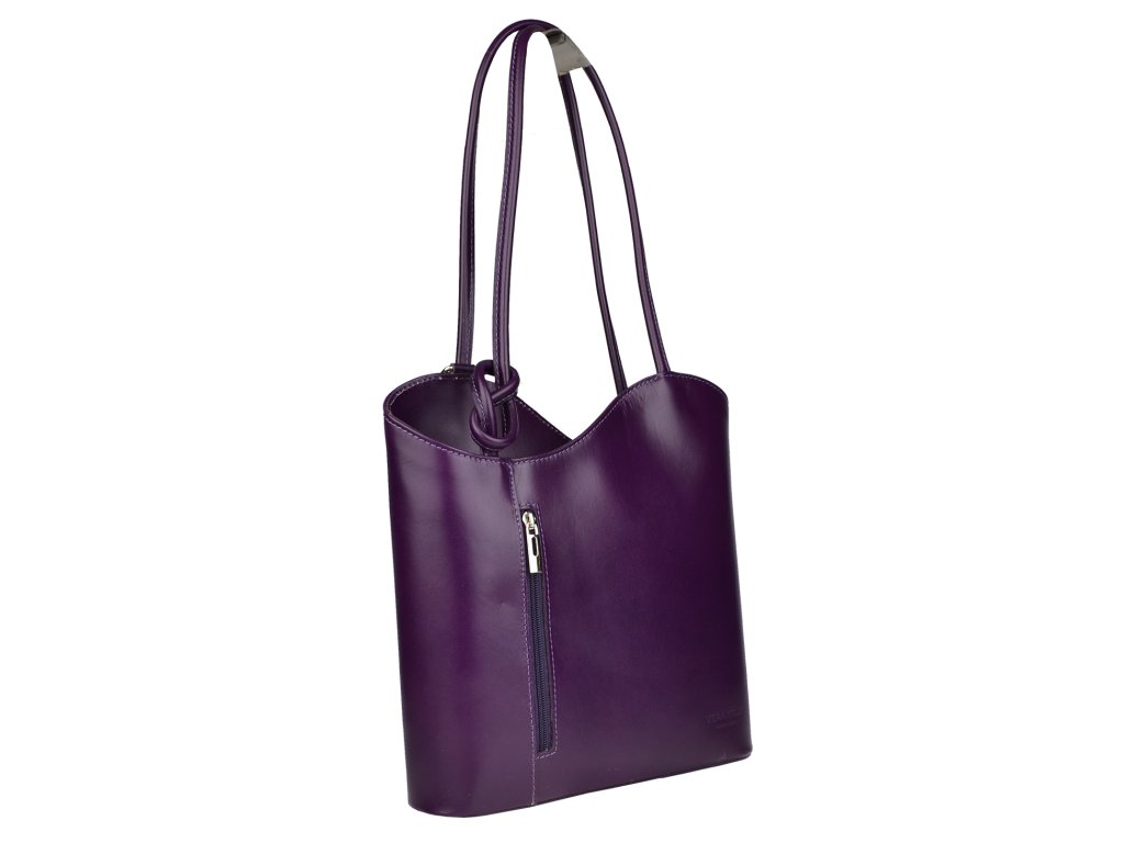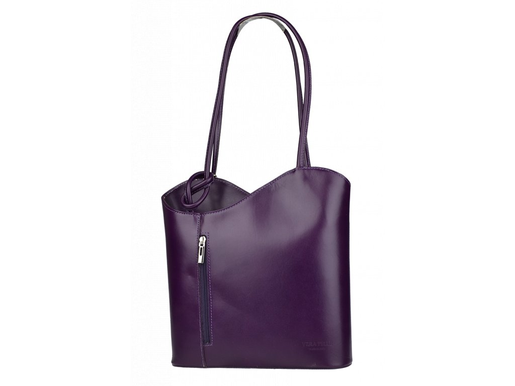Na prvý pohľad veľmi jednoduchá kabelka vo fialovej farbe, ktorá však má čo ponúknuť. Je vyrobená z pravej pevnej kože s hladkou textúrou a uzatvára sa pomocou zipsu. Má dômyselne zhotovené uši, ktoré umožňujú nosiť kabelku cez rameno alebo ako batôžtek na chrbte. Z oboch vonkajších strán disponuje vreckom na zips s vertikálnym zapínaním. Vnútro kabelky je priečkou, slúžiacou ako vrecko na zips, rozdelené na dve časti a ponúka dve malé priehradky a malé vrecko na zips, vhodné napríklad na telefón alebo peňaženku.