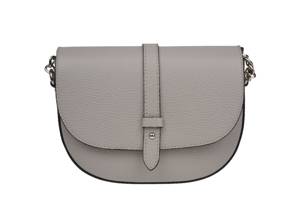 Sivá kabelka nositeľné cez rameno či cross-body (krížom). Táto kožená kabelka je uzatvárateľná na patentku a vnútri nájdeme priehradku na zips. Farba retiazky je strieborná. Kabelka má nastaviteľný popruh s maximálnou dlžka cca 125 cm.