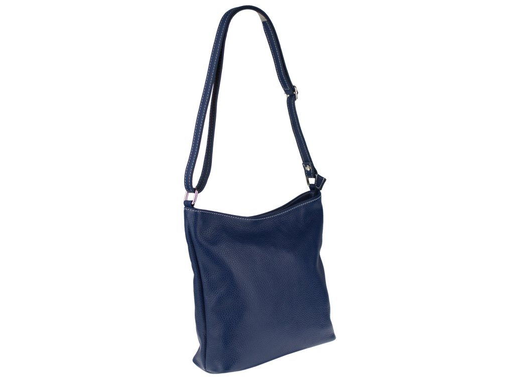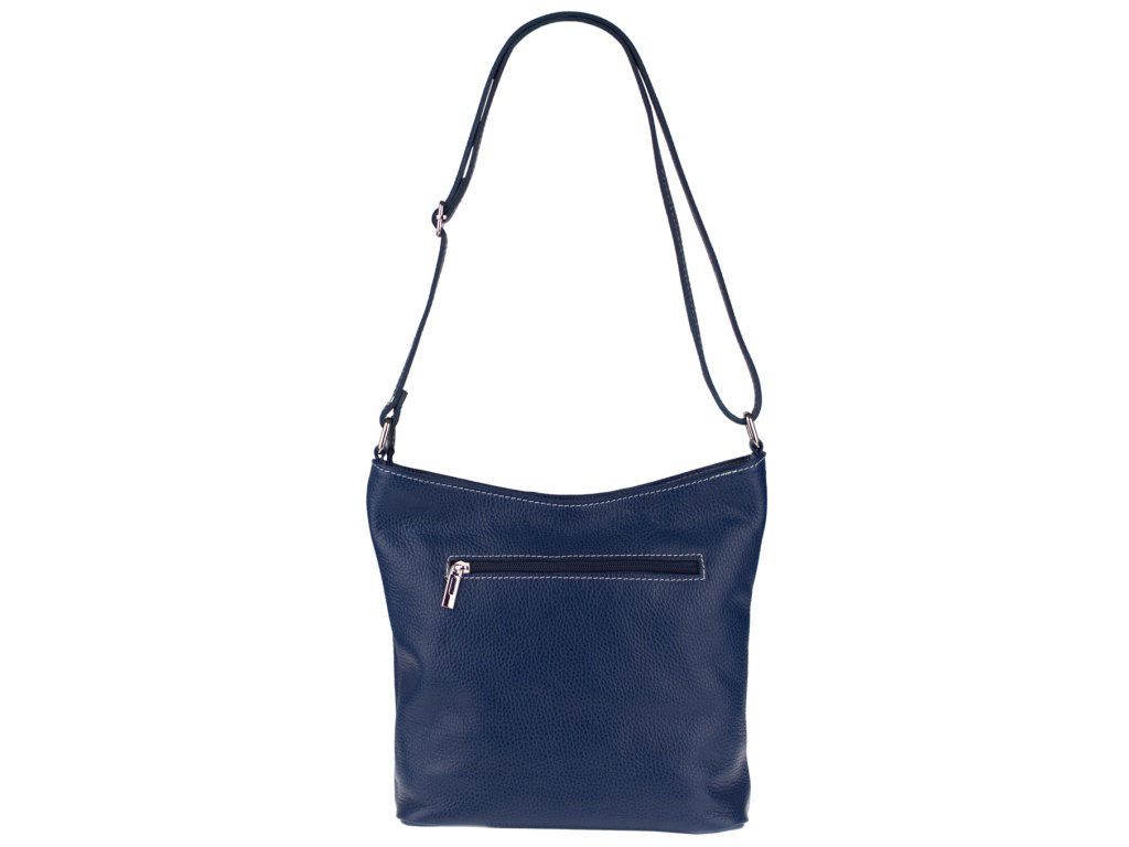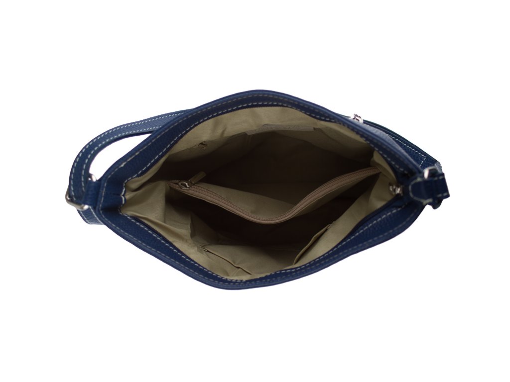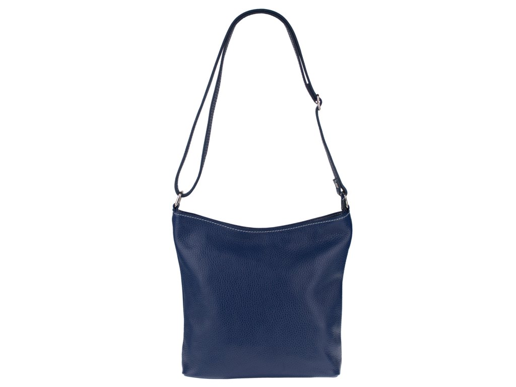Jednoduchá a praktická kabelka vhodná na každodenné nosenie v univerzálnej modrej farbe. Je vyrobená z pravej poctivej kože a uzatvára sa pomocou zipsu. Vo vnútri nájdete priečku uprostred, ktorá súčasne slúži ako vrecko na zips, a malé vrecko a priehradku na bočných stenách. Hĺbka dna tejto kabelky je 11 cm.