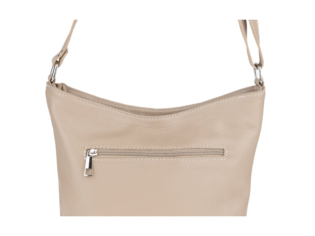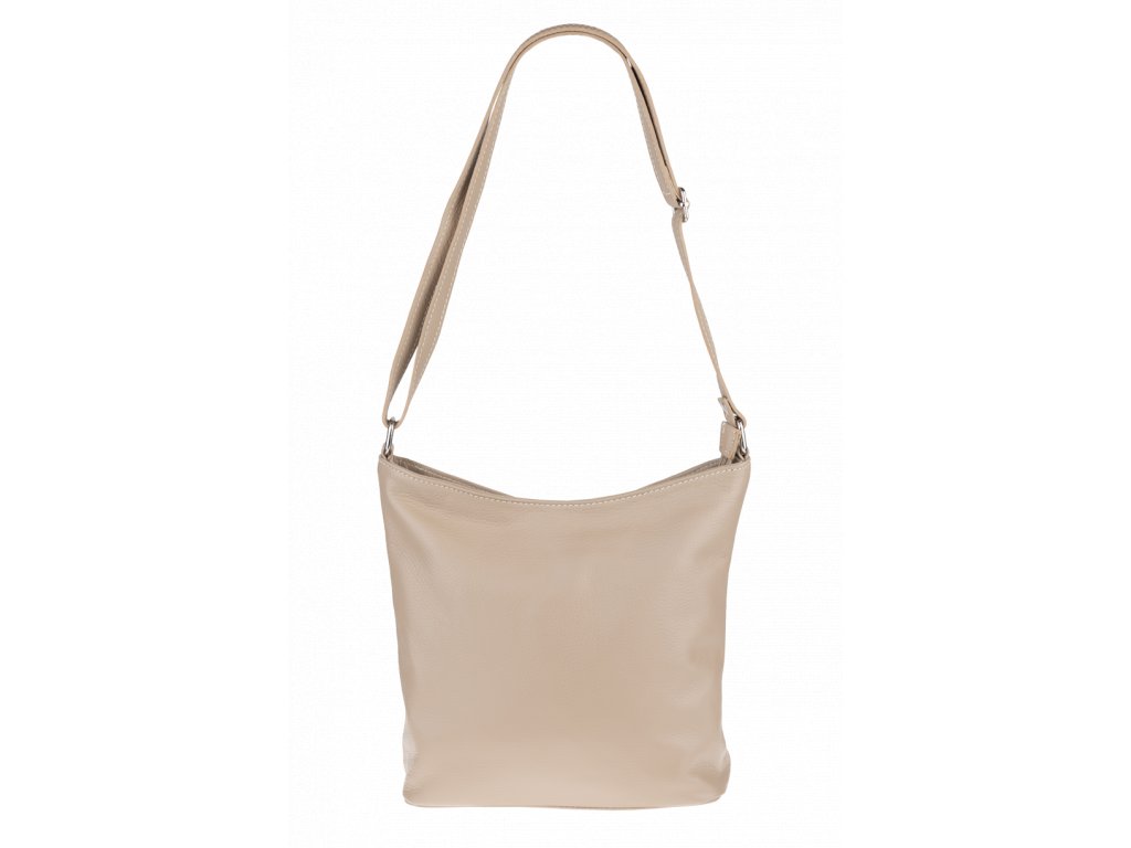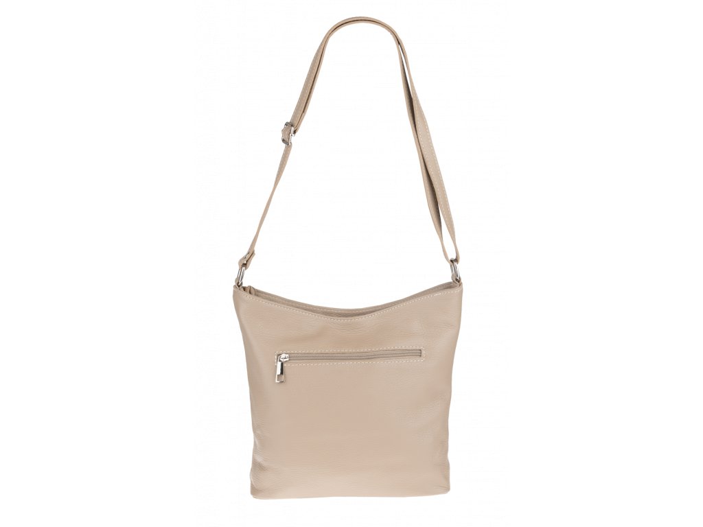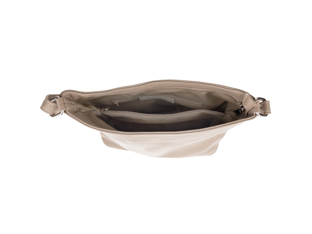 Jednoduchá a praktická kabelka vhodná na každodenné nosenie v univerzálnej hnedo-béžovej farbe. Je vyrobená z pravej poctivej kože a uzatvára sa pomocou zipsu. Vo vnútri nájdete priečku uprostred, ktorá súčasne slúži ako vrecko na zips, a malé vrecko a priehradku na bočných stenách. Hĺbka dna tejto kabelky je 11 cm.