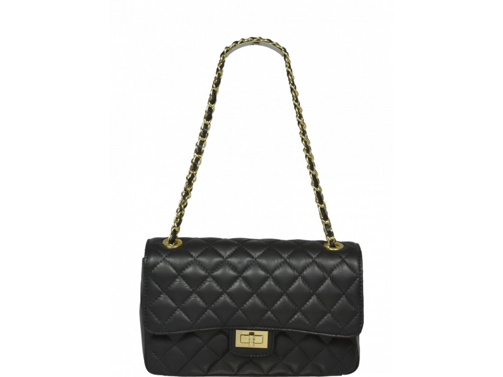 Kožená, elegantná kabelka v čiernej farbe so zlatými detalmi v modernom designe. Vo vnútri disponuje úložnou priehradkou na zips a zipsovacím vreckom.
