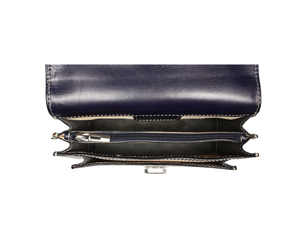 Menšie kožená modrá aktovka s pútkom na ruku sa hodí na všetky veci, ktoré potrebuje mať stále po ruke. Peňaženka, doklady od auta, kľúče a iné drobnosti budete mať pohromade. Aktovku je možné uzamknúť pomocou kľúča.