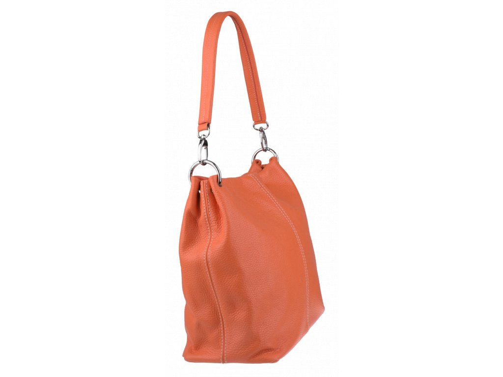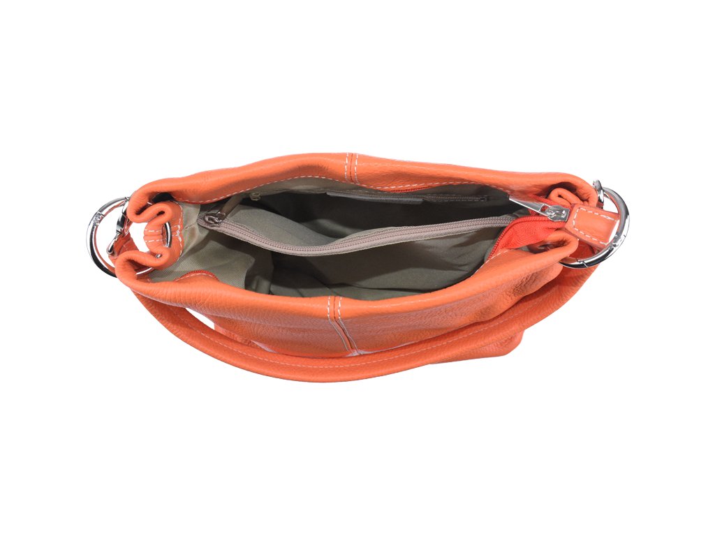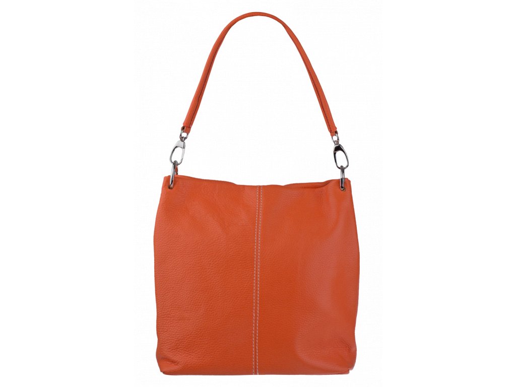 Oranžová kabelka s jednoduchým designom vhodná na nosenie cez rameno. Je vyrobená z pravej kože a uzatvára sa pomocou zipsu. Vo vnútri je kabelka rozdelená veľkým vreckom na dve časti a po stranách má ďalšie dve vrecká, z toho jedno otvorené. Hĺbka jej dna je 14,5 cm.
