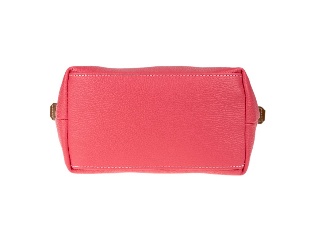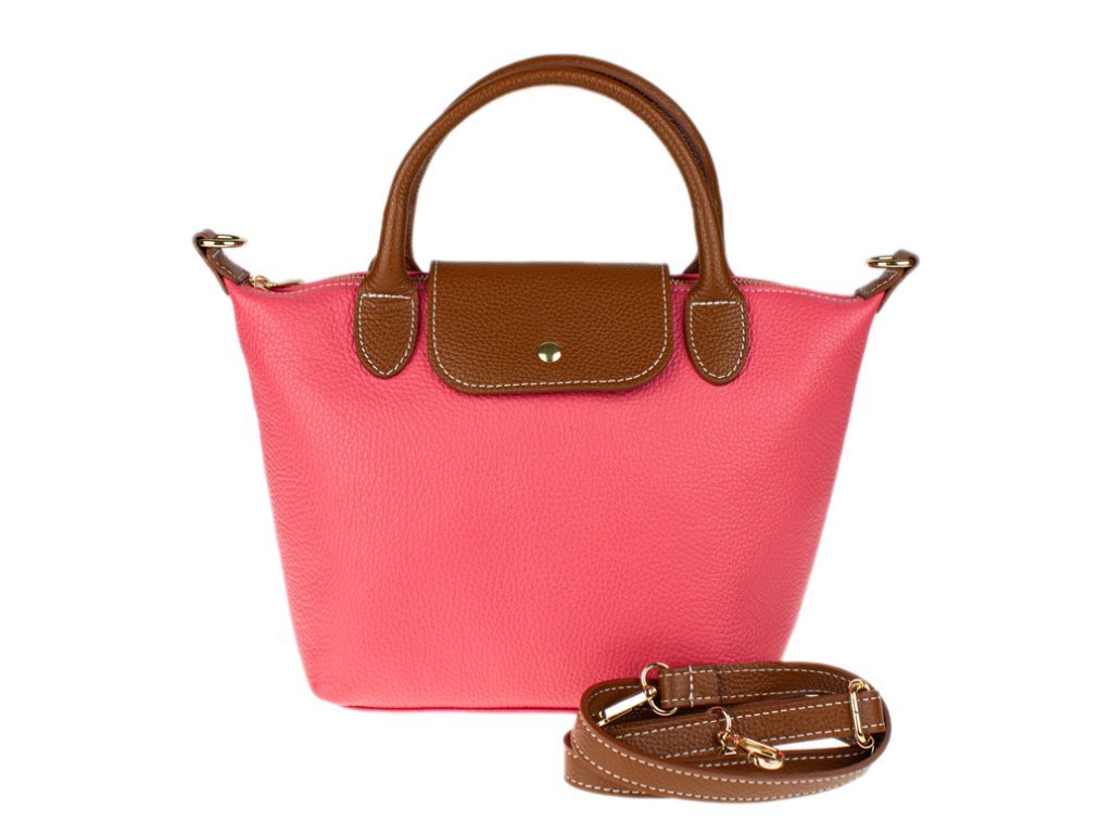 Kabelka je vyrobená z kvalitnej pravej kože s jemnou zrnitou štruktúrou, ktorá je nielen príjemná na dotyk, ale aj odolná voči poškriabaniu. Dizajn stavia na osvedčenú kombináciu ružovej farby tela kabelky s kontrastnými detailmi v koňakovom odtieni (ucha, klopa, popruh). Celkový luxusný dojem dopĺňa decentné zlaté kovanie a precízne svetlé prešívanie.