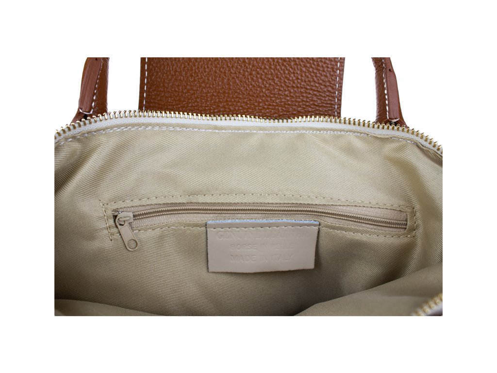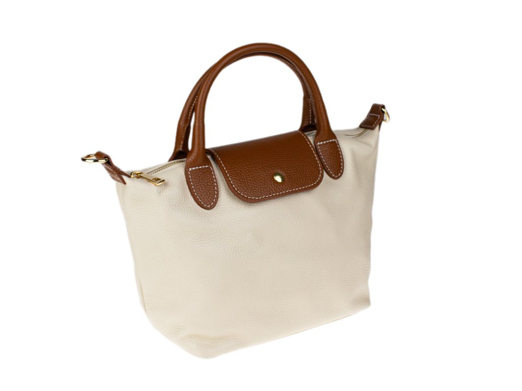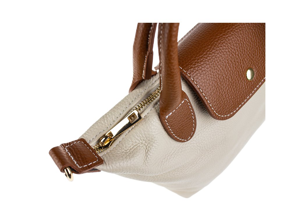 Kabelka je vyrobená z kvalitnej pravej kože s jemnou zrnitou štruktúrou, ktorá je nielen príjemná na dotyk, ale aj odolná voči poškriabaniu. Dizajn stavia na osvedčenú kombináciu béžovej farby tela kabelky s kontrastnými detailmi v koňakovom odtieni (ucha, klopa, popruh). Celkový luxusný dojem dopĺňa decentné zlaté kovanie a precízne svetlé prešívanie.