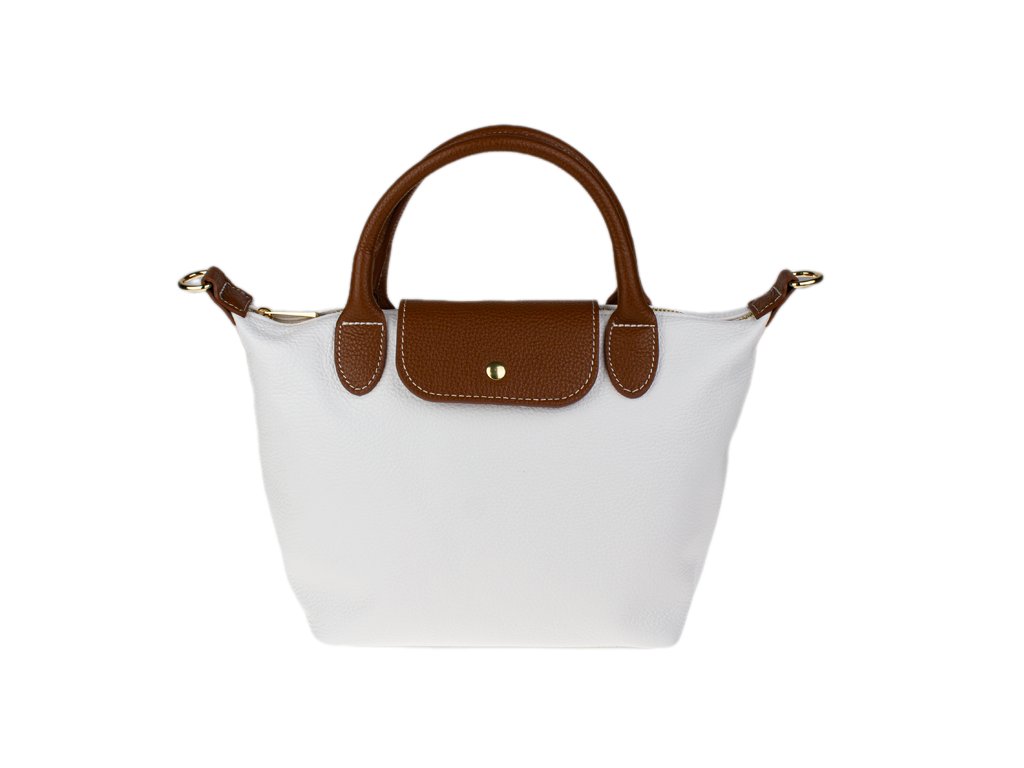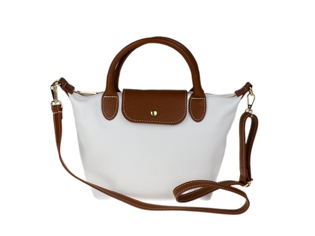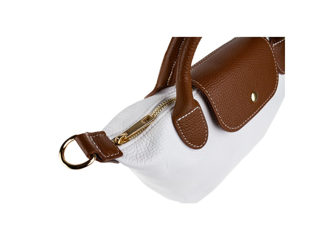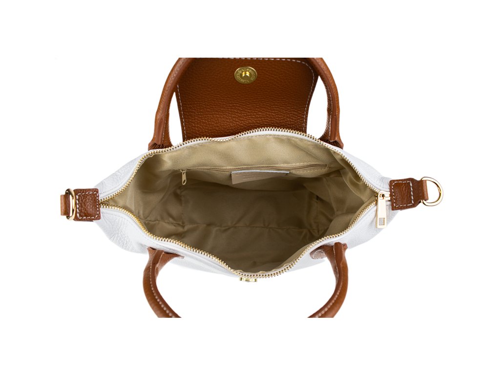Kabelka je vyrobená z kvalitnej pravej kože s jemnou zrnitou štruktúrou, ktorá je nielen príjemná na dotyk, ale aj odolná voči poškriabaniu. Dizajn stavia na osvedčenú kombináciu bielej farby tela kabelky s kontrastnými detailmi v koňakovom odtieni (ucha, klopa, popruh). Celkový luxusný dojem dopĺňa decentné zlaté kovanie a precízne svetlé prešívanie.