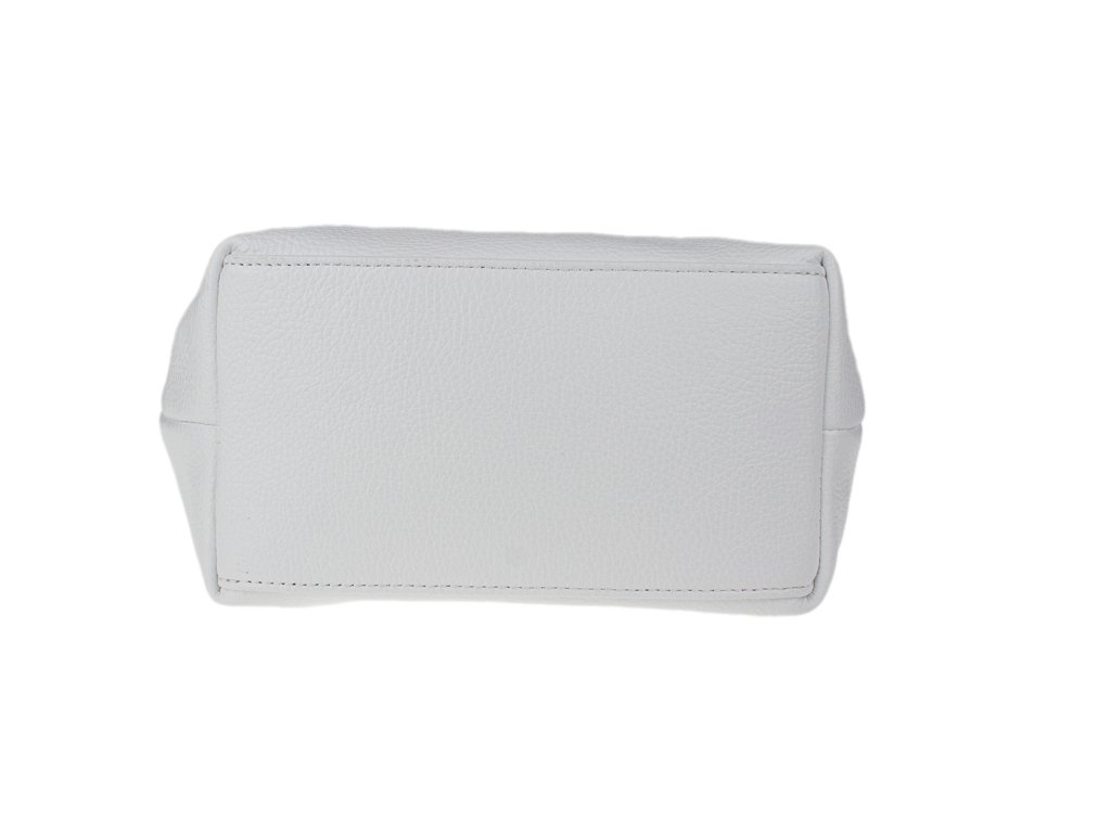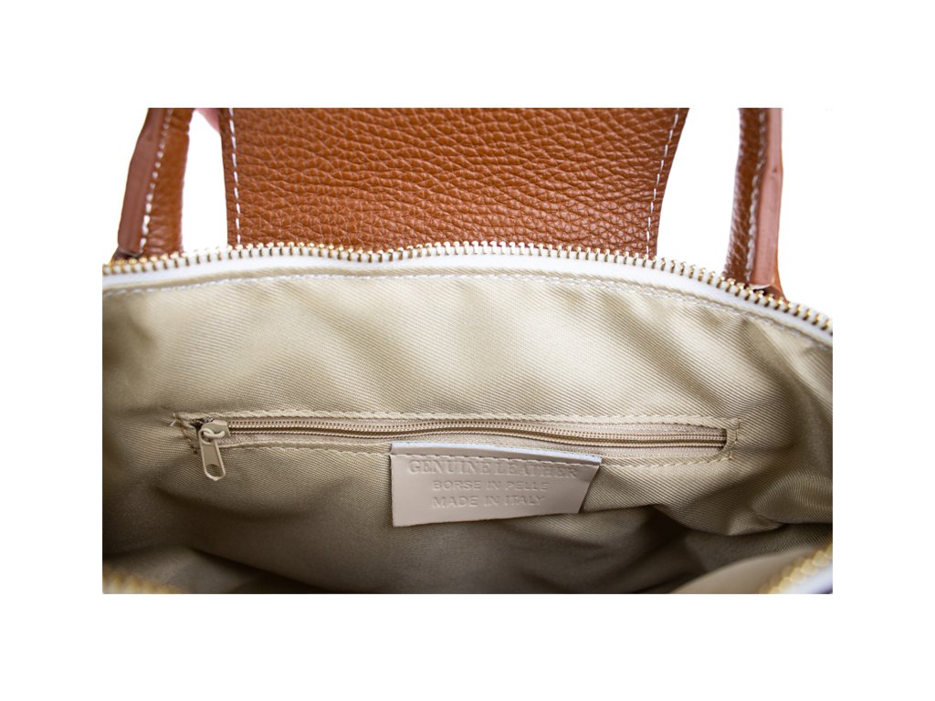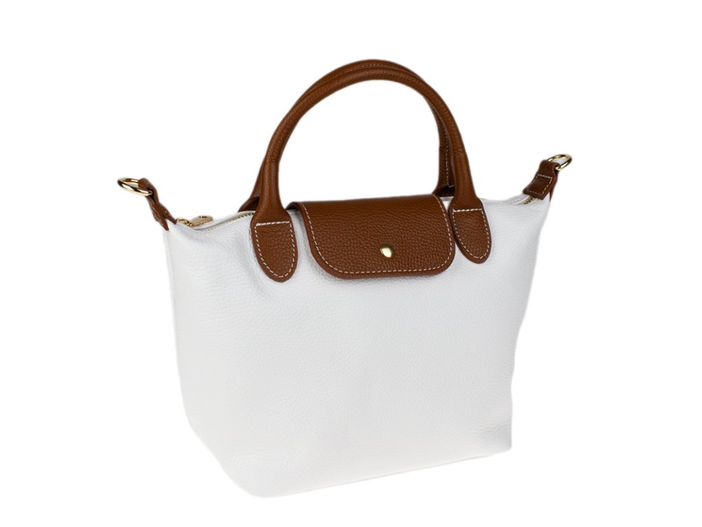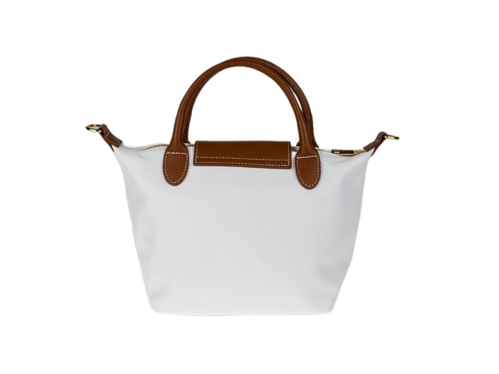 Kabelka je vyrobená z kvalitnej pravej kože s jemnou zrnitou štruktúrou, ktorá je nielen príjemná na dotyk, ale aj odolná voči poškriabaniu. Dizajn stavia na osvedčenú kombináciu bielej farby tela kabelky s kontrastnými detailmi v koňakovom odtieni (ucha, klopa, popruh). Celkový luxusný dojem dopĺňa decentné zlaté kovanie a precízne svetlé prešívanie.