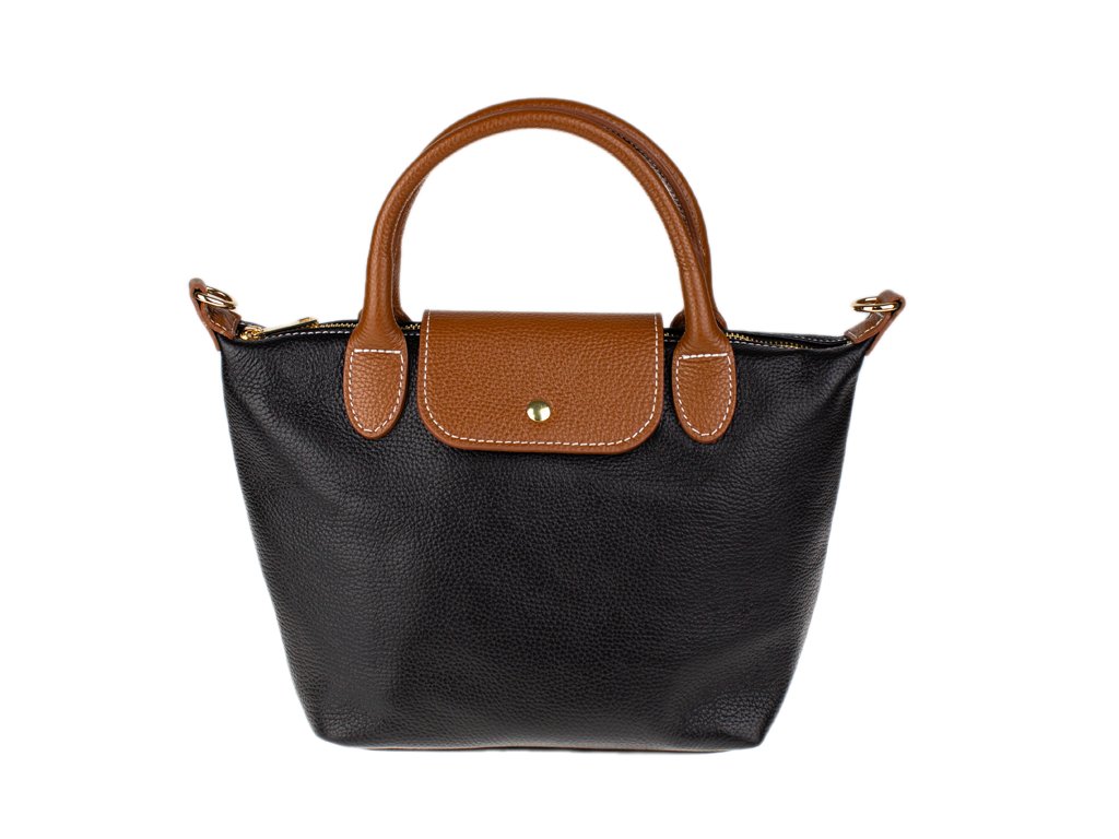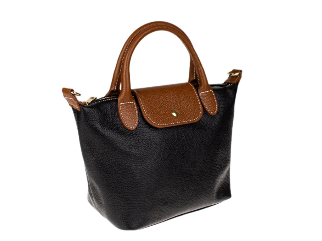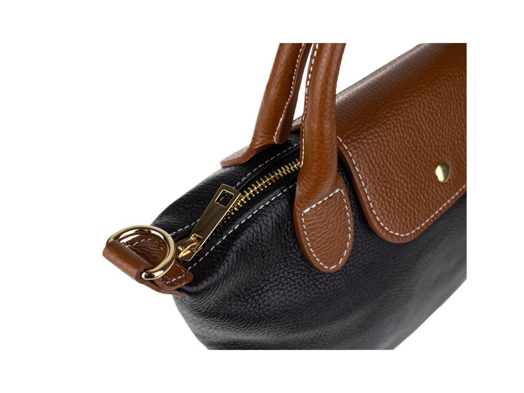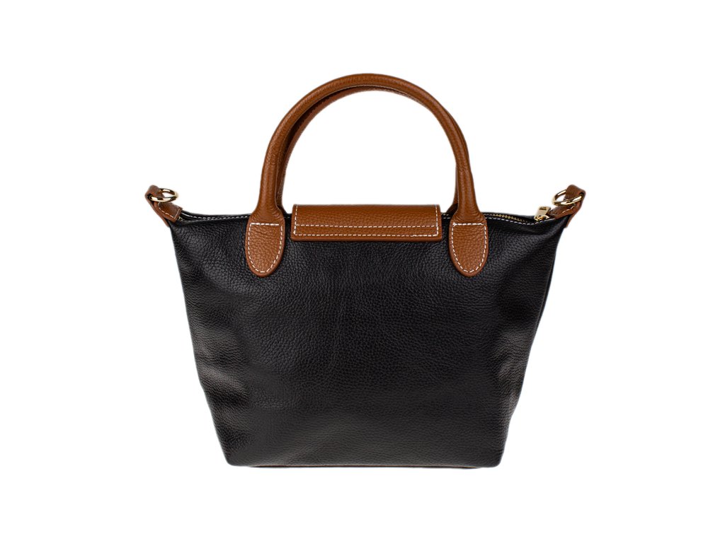 Kabelka je vyrobená z kvalitnej pravej kože s jemnou zrnitou štruktúrou, ktorá je nielen príjemná na dotyk, ale aj odolná voči poškriabaniu. Dizajn stavia na osvedčenú kombináciu čiernej farby tela kabelky s kontrastnými detailmi v koňakovom odtieni (ucha, klopa, popruh). Celkový luxusný dojem dopĺňa decentné zlaté kovanie a precízne svetlé prešívanie.