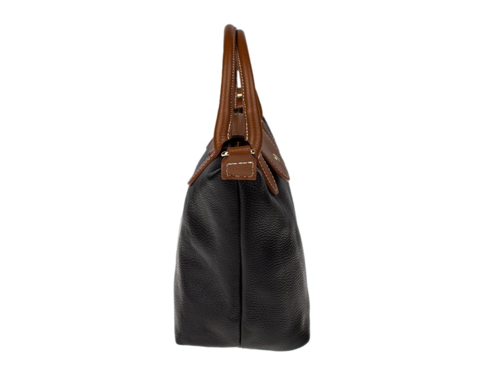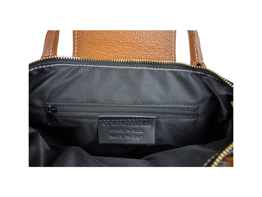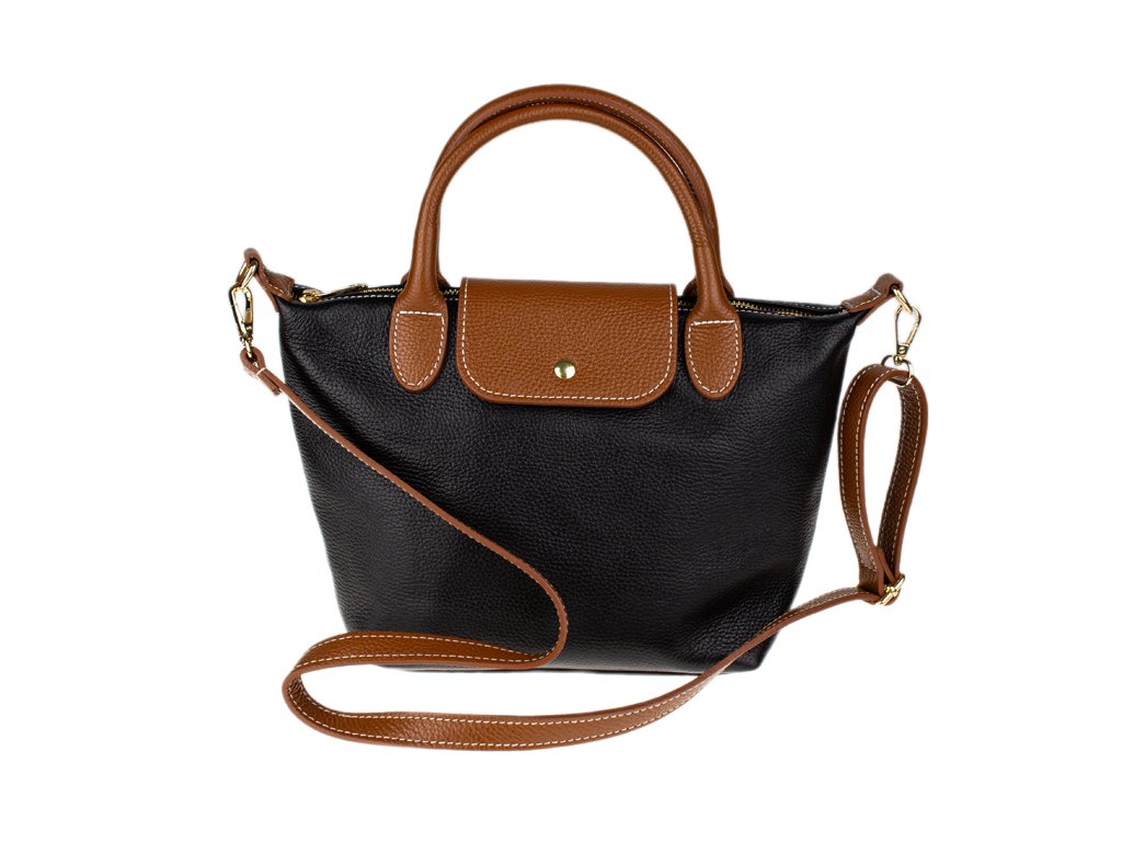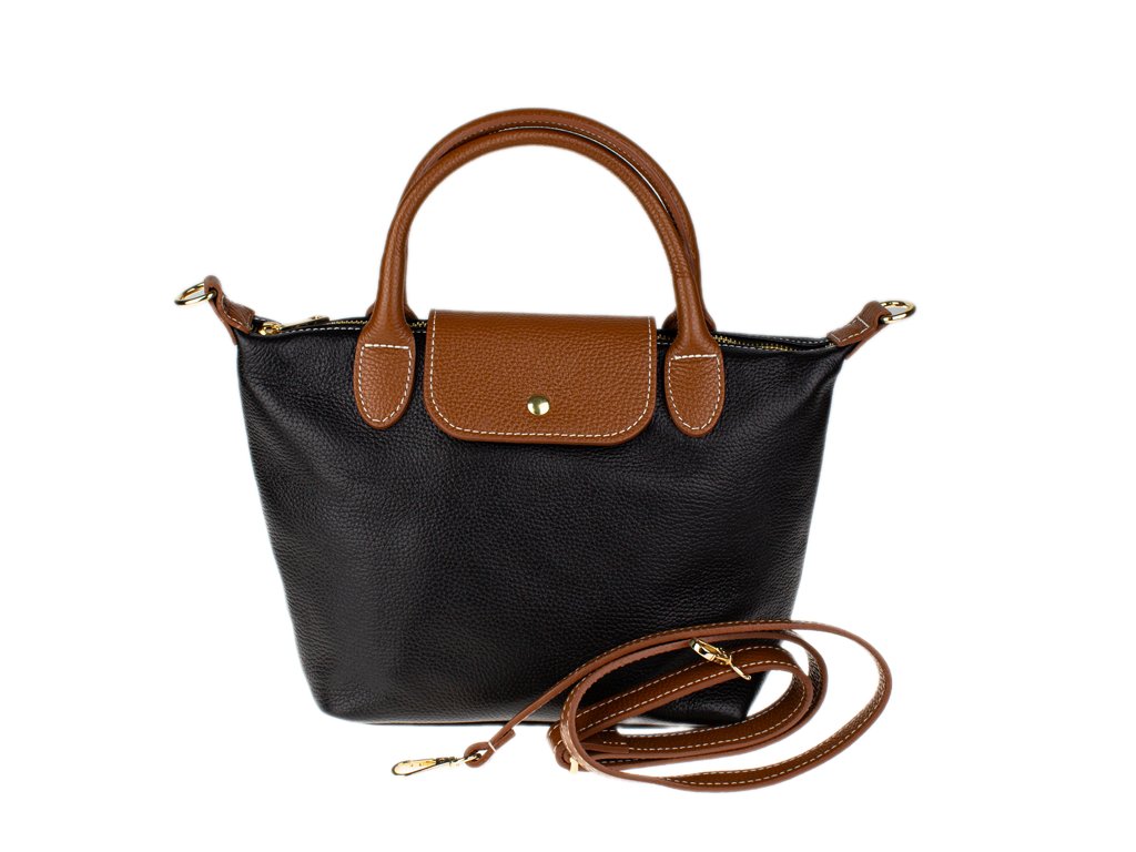 Kabelka je vyrobená z kvalitnej pravej kože s jemnou zrnitou štruktúrou, ktorá je nielen príjemná na dotyk, ale aj odolná voči poškriabaniu. Dizajn stavia na osvedčenú kombináciu čiernej farby tela kabelky s kontrastnými detailmi v koňakovom odtieni (ucha, klopa, popruh). Celkový luxusný dojem dopĺňa decentné zlaté kovanie a precízne svetlé prešívanie.