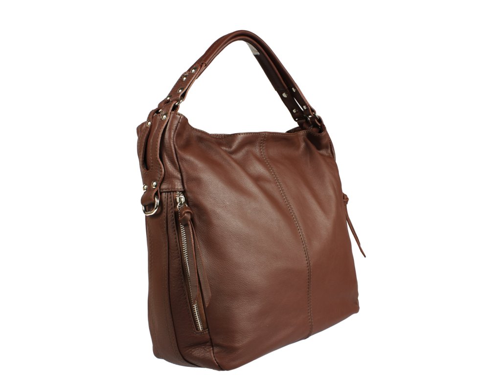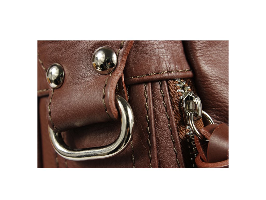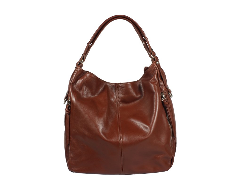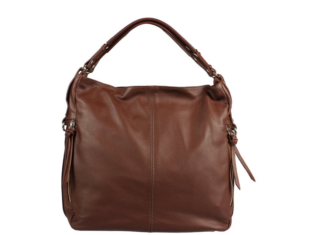 Táto hnedá kožená kabelka sa nosí cez rameno a je vhodná ako pre voľný čas, tak aj do práce. Dobre Vám môžu poslúžiť dve vrecká na zips, ktoré nájdete na jej boku. Samotná kabelka je uzatvárateľná taktiež na zips. Jej vnútro disponuje jedným malým vreckom a priečkou, ktorá slúži ako ďalšie vrecko. Hĺbka jej dna je 13,5 cm.