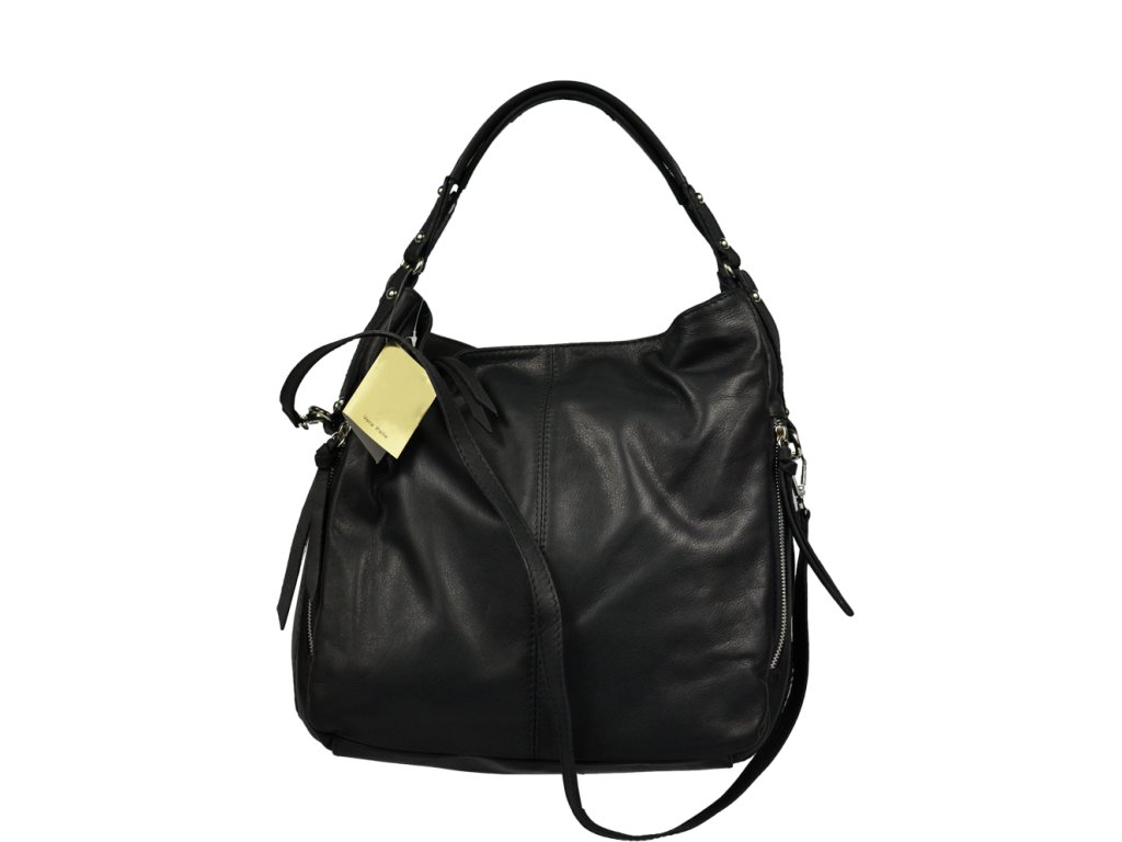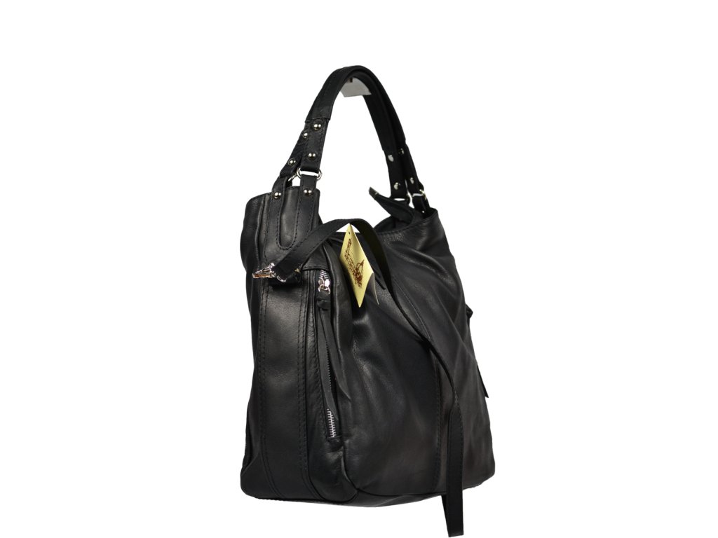 Táto čierna kožená kabelka sa nosí cez rameno a je vhodná ako pre voľný čas, tak aj do práce. Dobre Vám môžu poslúžiť dve vrecká na zips, ktoré nájdete na jej boku. Samotná kabelka je uzatvárateľná taktiež na zips. Jej vnútro disponuje jedným malým vreckom a priečkou, ktorá slúži ako ďalšie vrecko. Hĺbka jej dna je 13,5 cm.