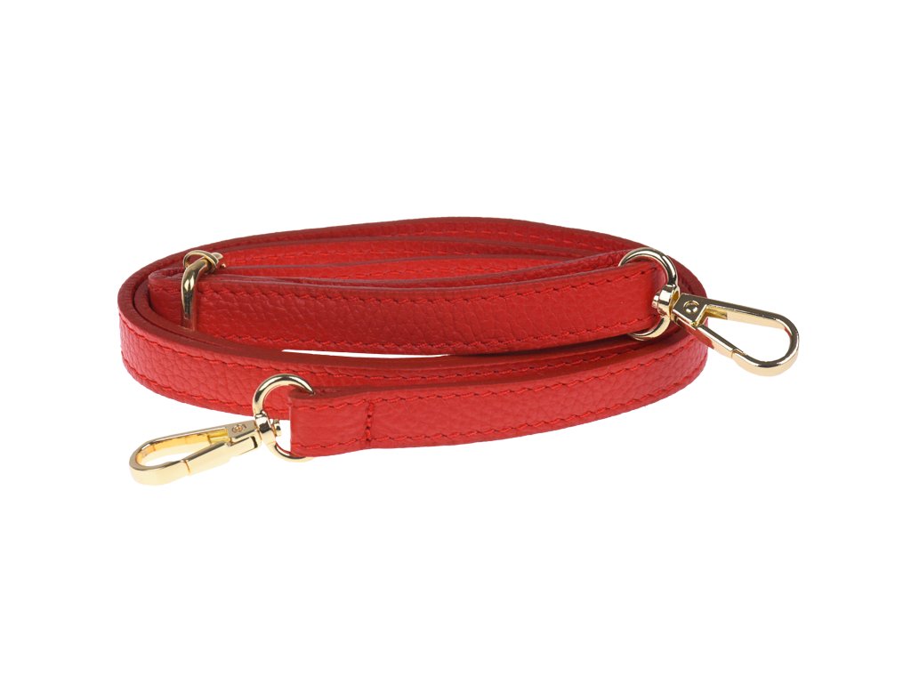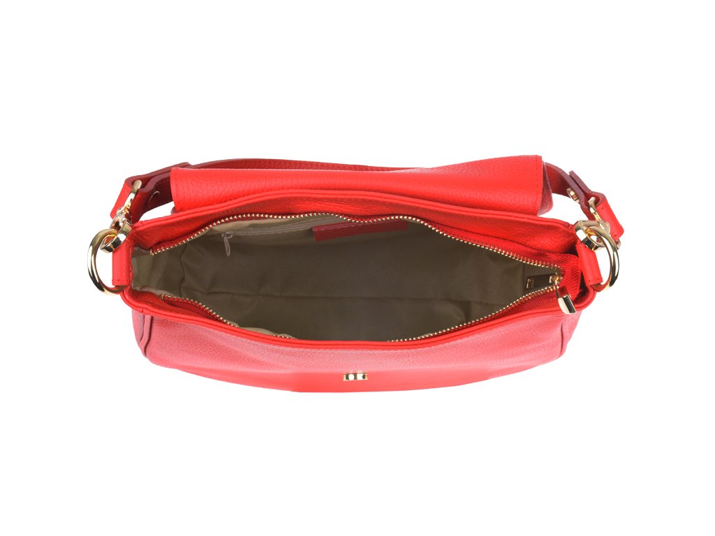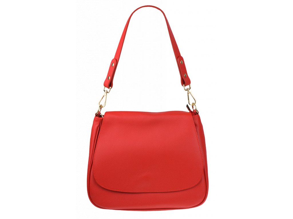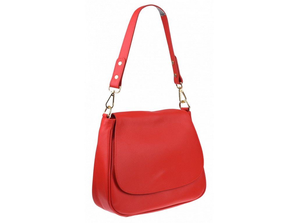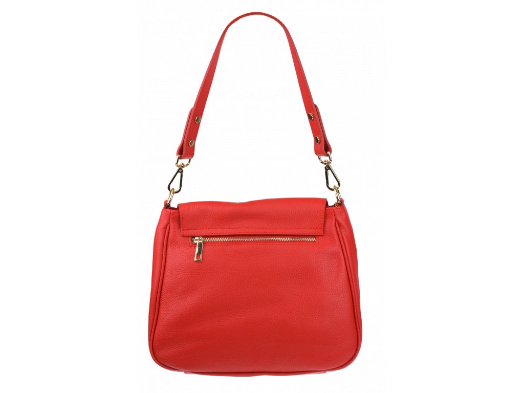 Kožená, elegantná kabelka ve červenej farbe v modernom designe. Dĺžka prídavného popruhu je 117 cm.