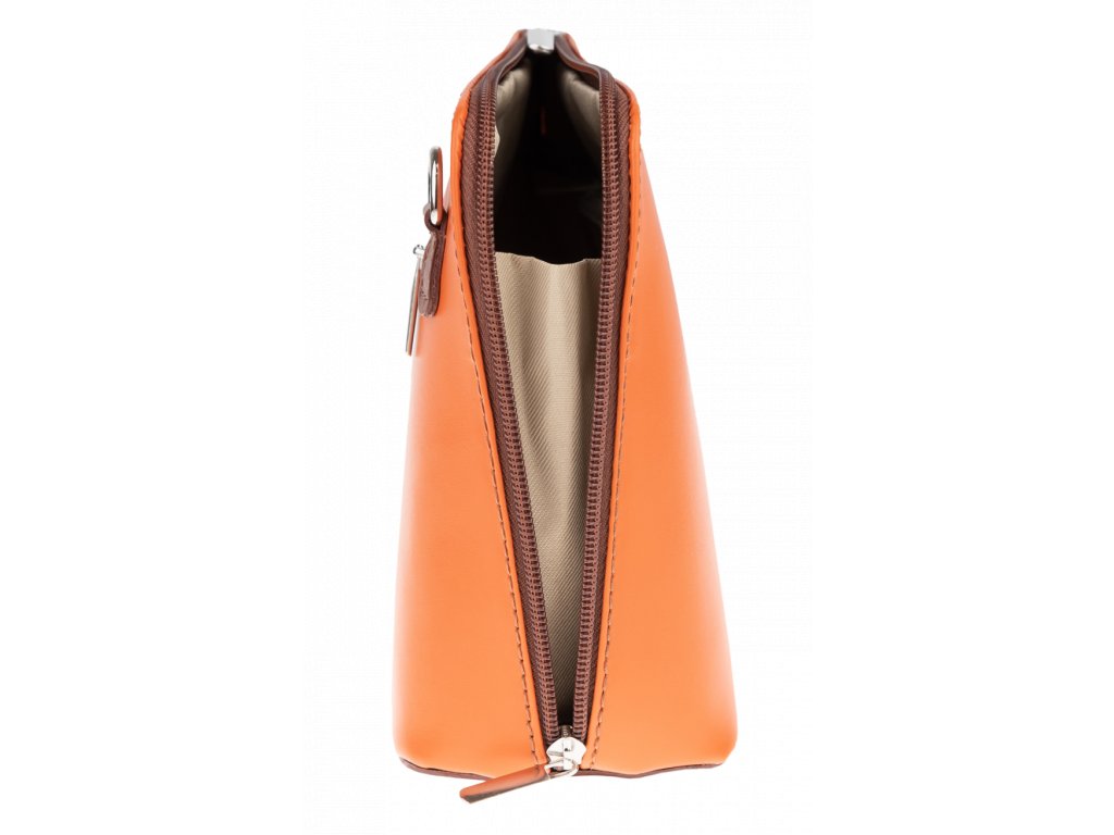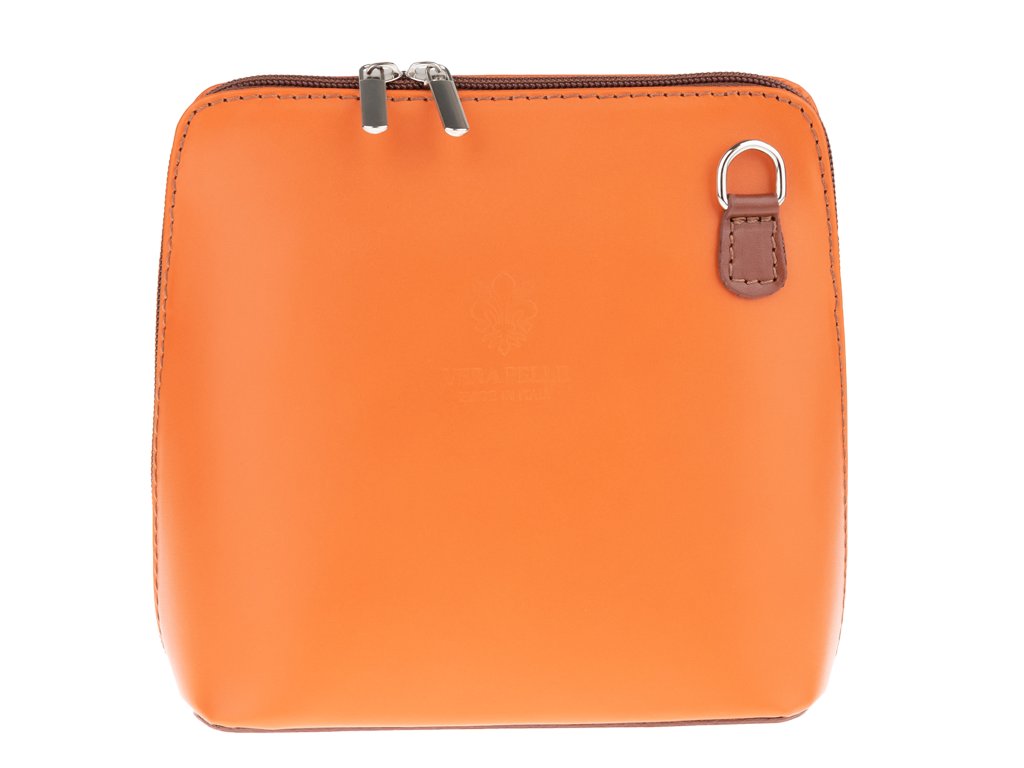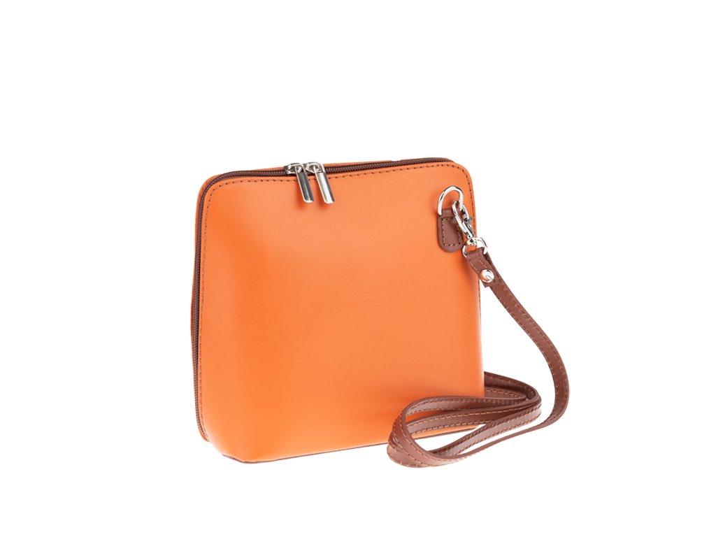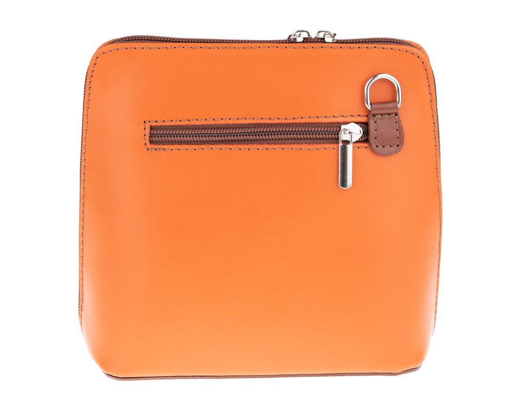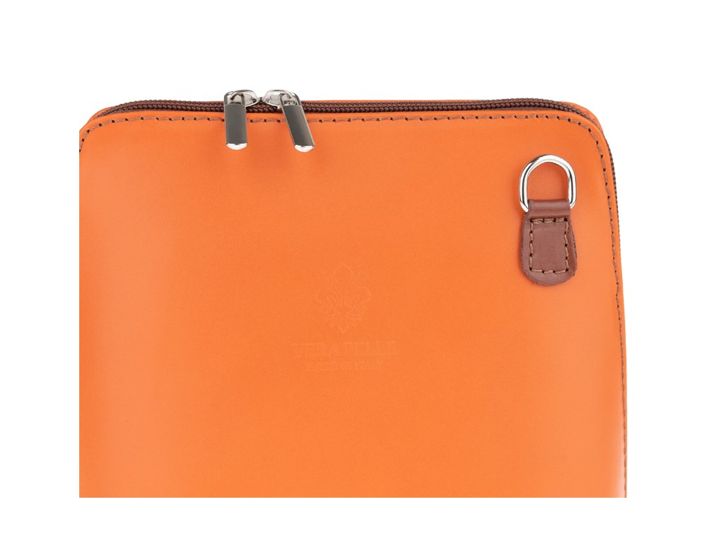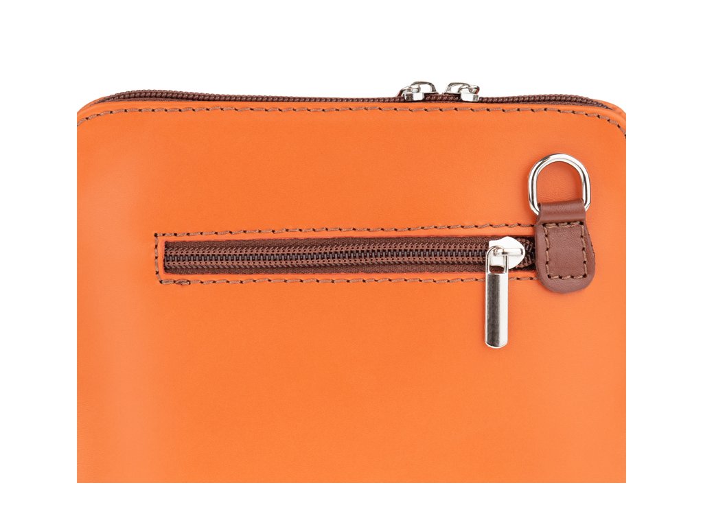 Elegantná, no zároveň veľmi praktická oranžová kabelka malých rozmerov vyrobená z pravej kože. Vďaka tenkému popruhu je nositeľná cez rameno. Zips, ktorým sa uzatvára, vedie po hrane kabelky až po spodný okraj na oboch stranách, a preto je jej vnútro dobre dostupné. Na vonkajšej zadnej strane nájdete na kabelke malé vrecko na zips a vo vnútri delí celý priestor na dve časti priečka, ktorá súčasne slúži ako vrecko na zips. Hĺbka jej dna je 8 cm.