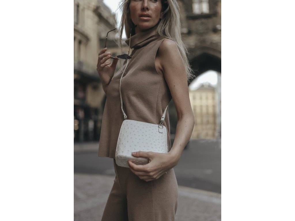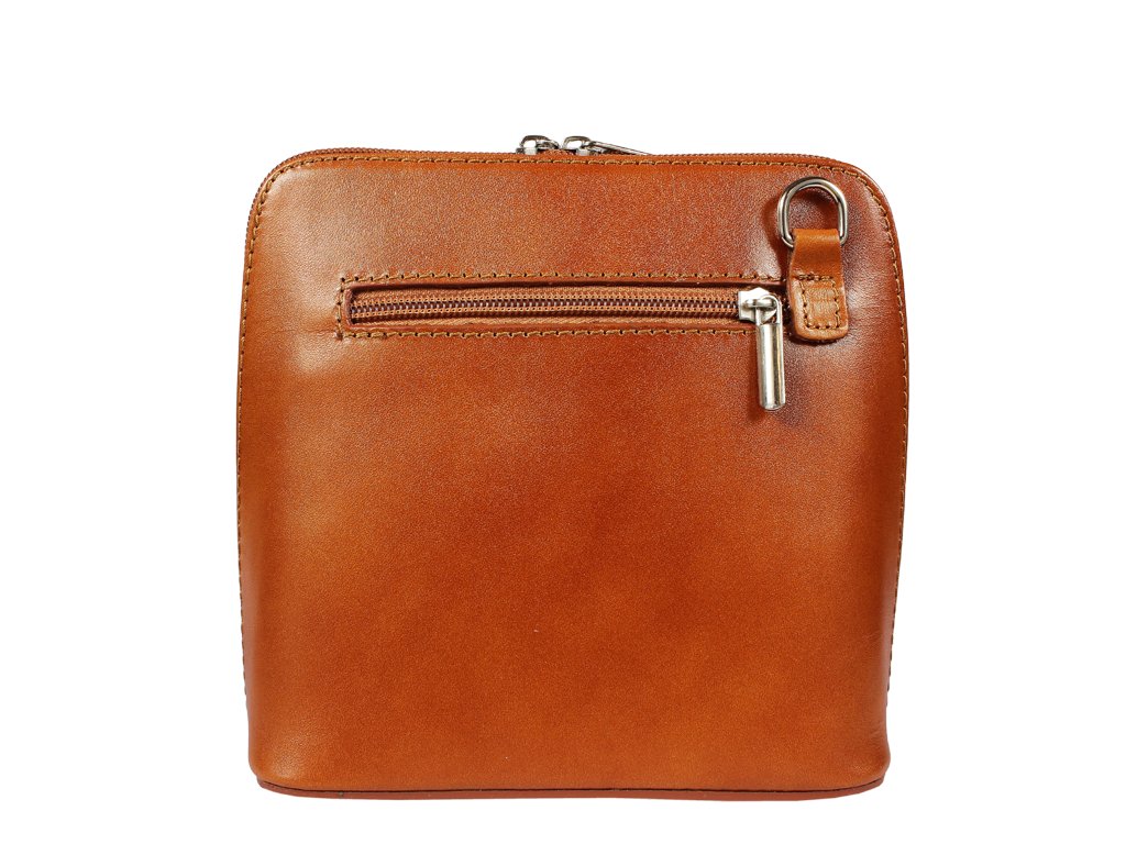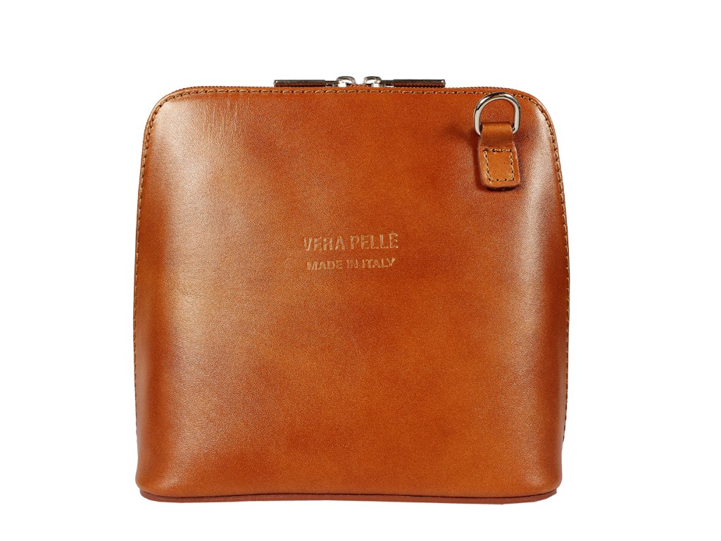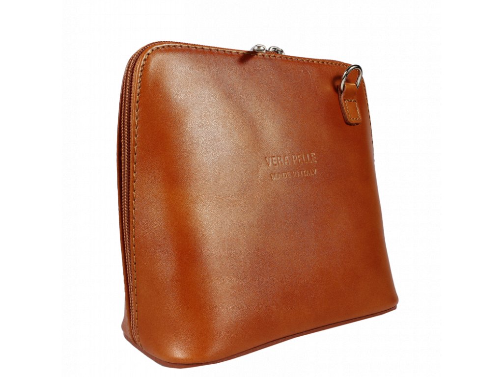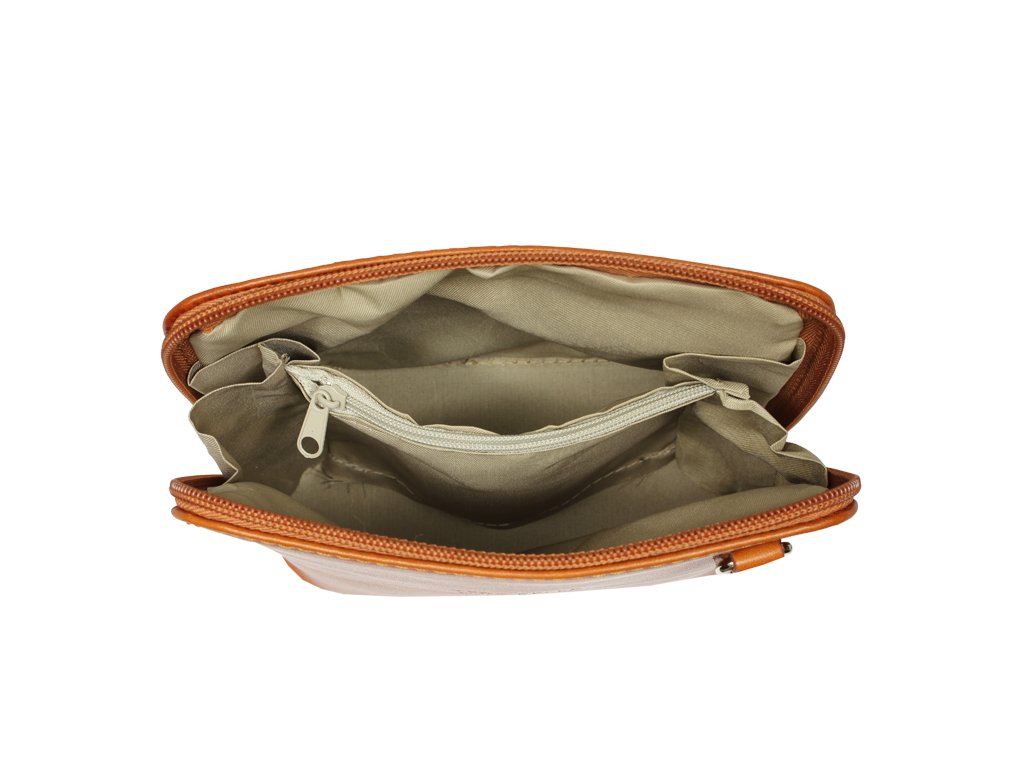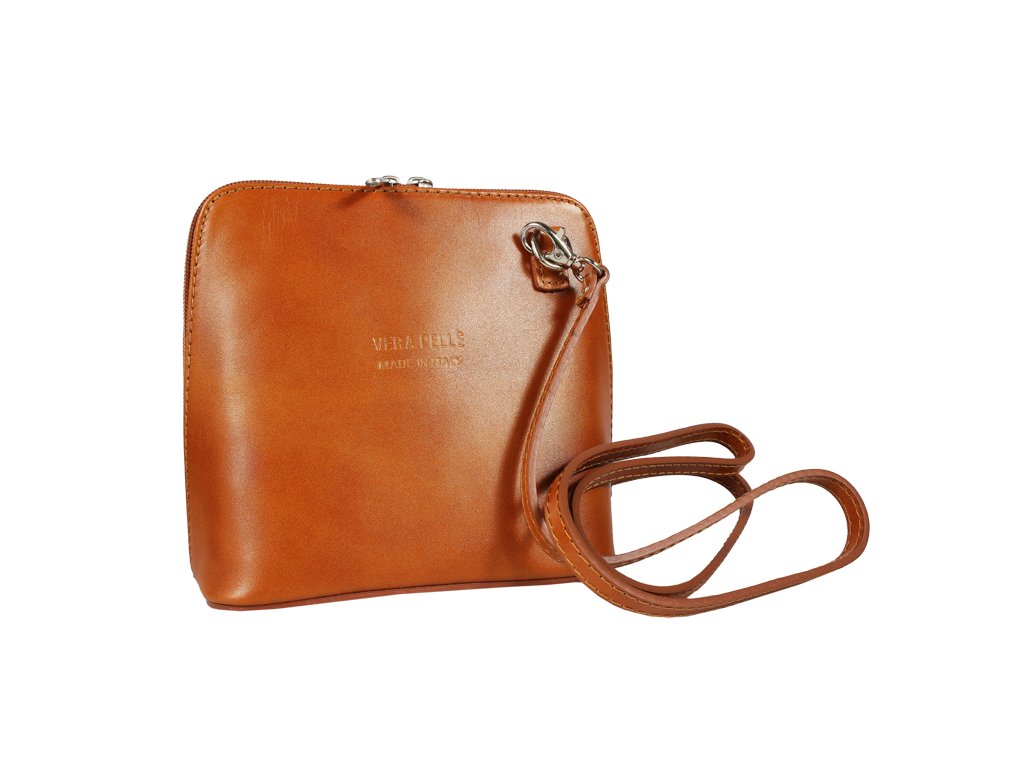 Elegantná, no zároveň veľmi praktická kabelka malých rozmerov vyrobená z pravej kože vo farbe camel. Vďaka tenkému popruhu je nositeľná cez rameno. Zips, ktorým sa uzatvára, vedie po hrane kabelky až po spodný okraj na oboch stranách, a preto je jej vnútro dobre dostupné. Na vonkajšej zadnej strane nájdete na kabelke malé vrecko na zips a vo vnútri delí celý priestor na dve časti priečka, ktorá súčasne slúži ako vrecko na zips. Hĺbka jej dna je 8 cm. Dĺžka prídavného popruhu je cca 120 cm.