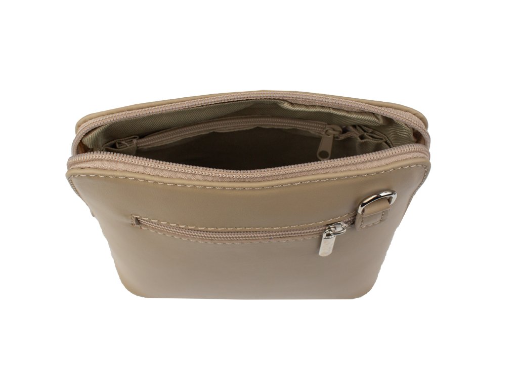 Elegantná, no zároveň veľmi praktická kabelka malých rozmerov vyrobená z pravej kože. Vďaka tenkému popruhu je nositeľná cez rameno. Zips, ktorým sa uzatvára, vedie po hrane kabelky až po spodný okraj na oboch stranách, a preto je jej vnútro dobre dostupné. Na vonkajšej zadnej strane nájdete na kabelke malé vrecko na zips a vo vnútri delí celý priestor na dve časti priečka, ktorá súčasne slúži ako vrecko na zips. Hĺbka jej dna je 8 cm.