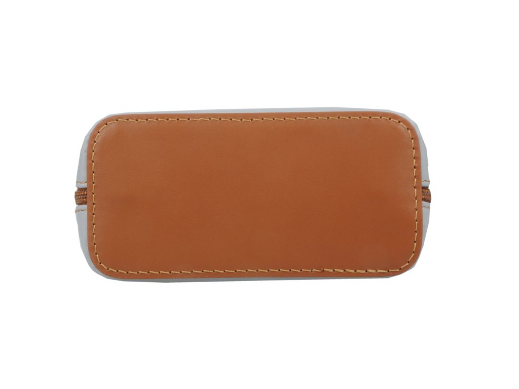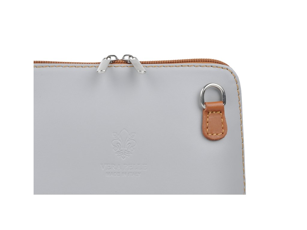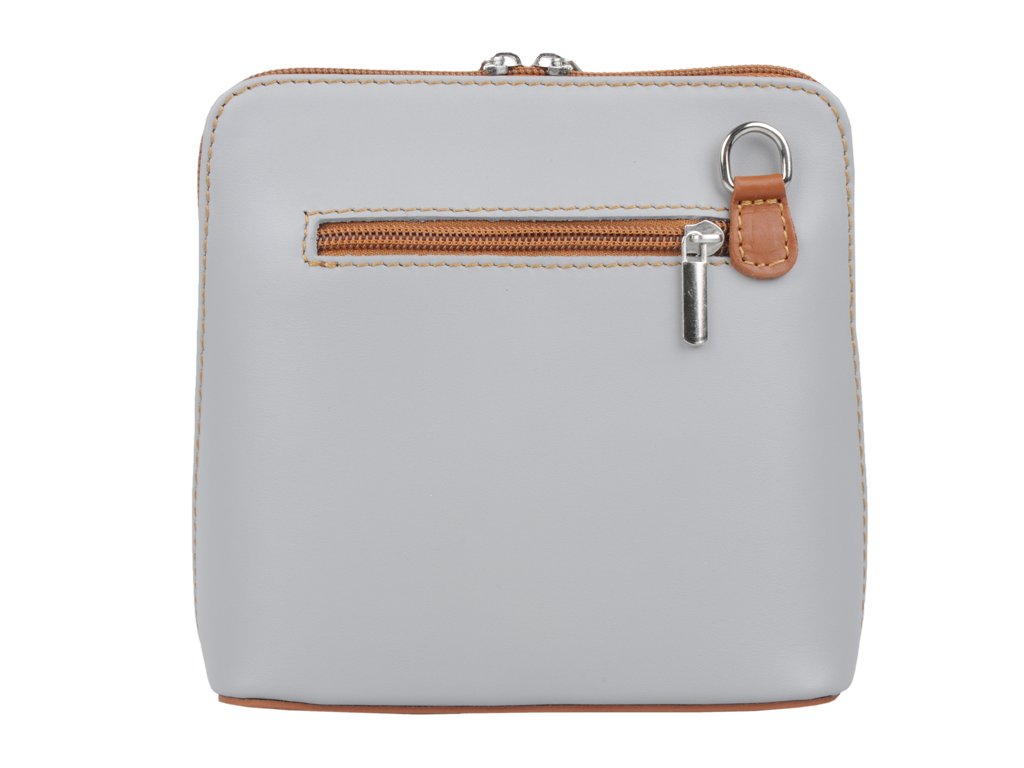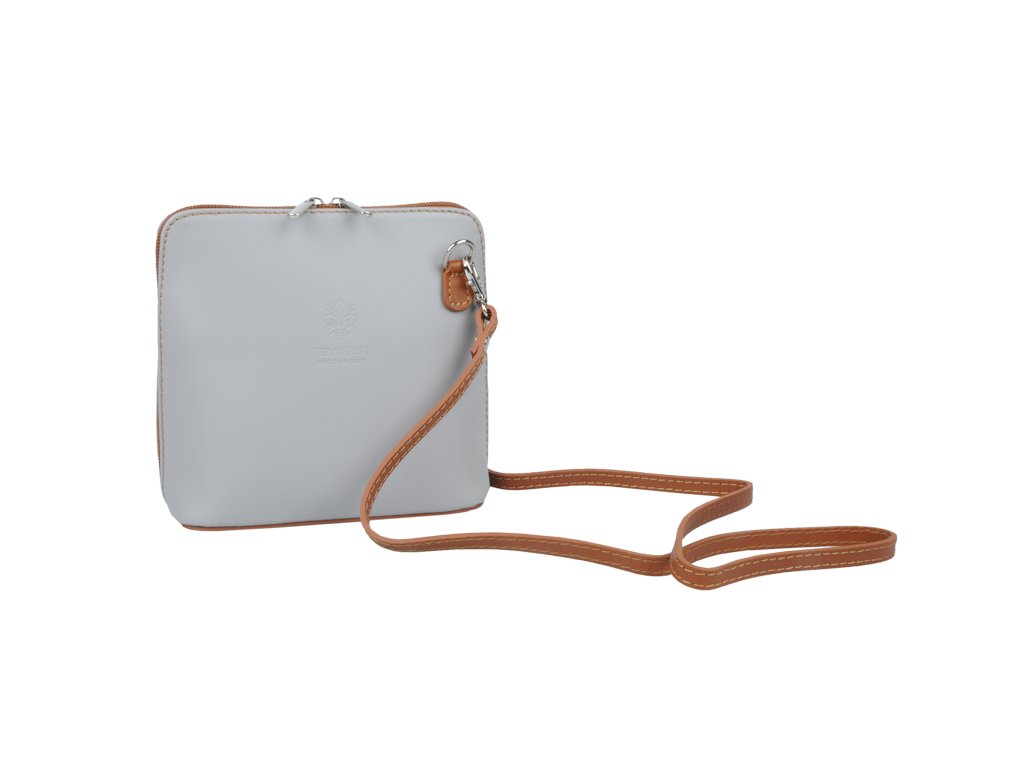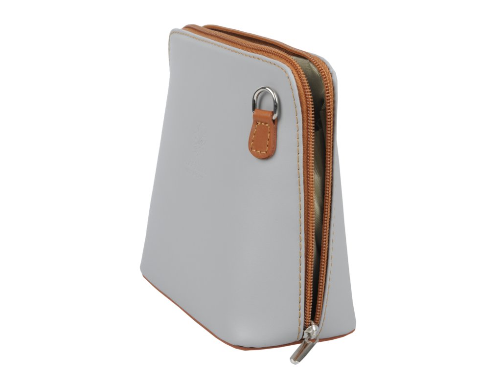Elegantná, no zároveň veľmi praktická sivá kabelka malých rozmerov vyrobená z pravej kože. Vďaka tenkému popruhu je nositeľná cez rameno. Zips, ktorým sa uzatvára, vedie po hrane kabelky až po spodný okraj na oboch stranách, a preto je jej vnútro dobre dostupné. Na vonkajšej zadnej strane nájdete na kabelke malé vrecko na zips a vo vnútri delí celý priestor na dve časti priečka, ktorá súčasne slúži ako vrecko na zips. Hĺbka jej dna je 8 cm. Dĺžka prídavného popruhu je cca 120 cm.