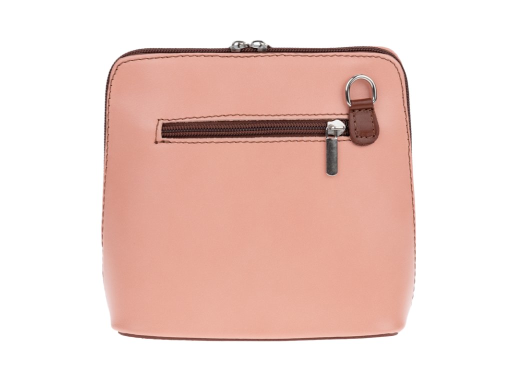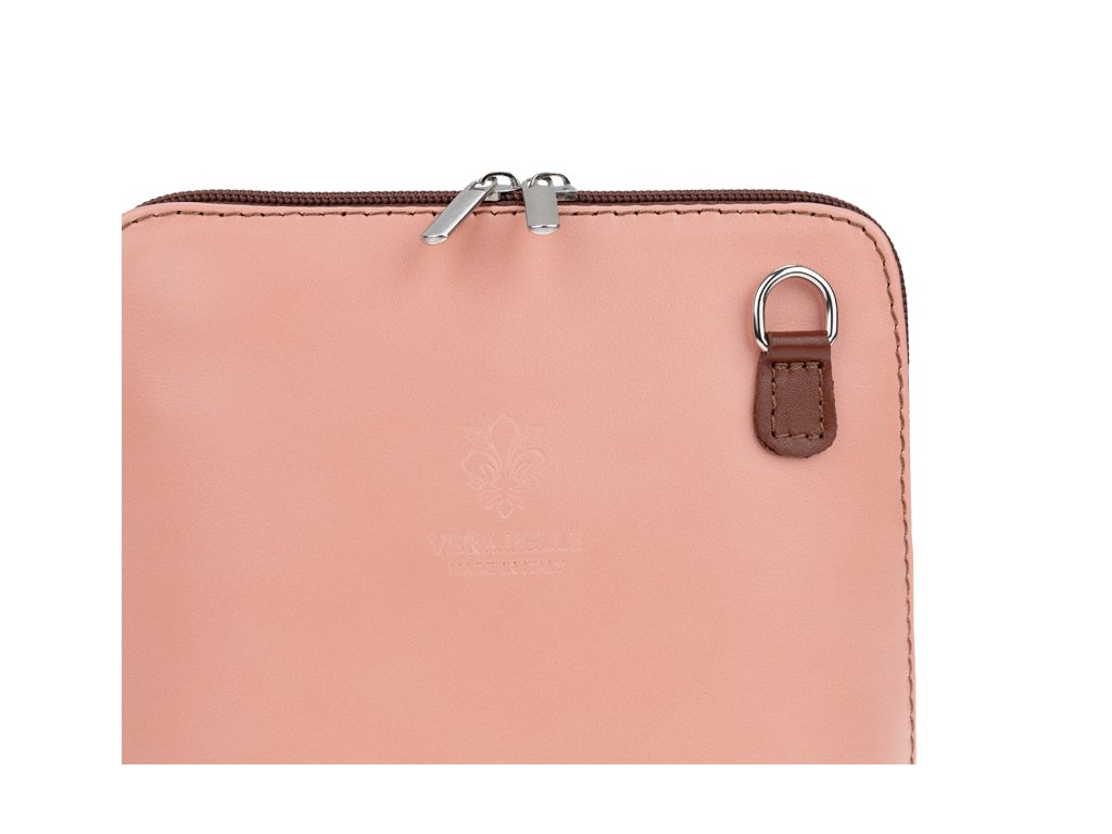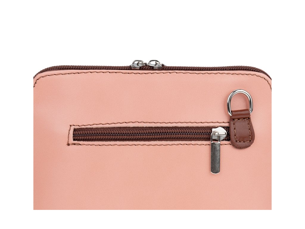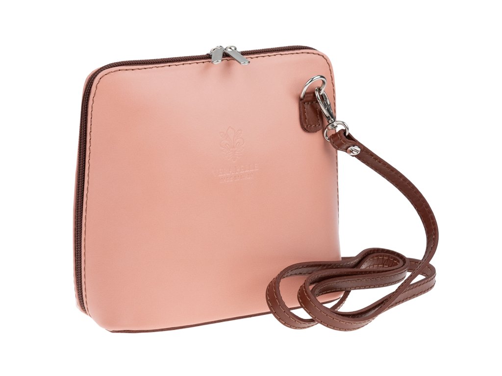 Elegantná, no zároveň veľmi praktická ružová kabelka malých rozmerov vyrobená z pravej kože. Vďaka tenkému popruhu je nositeľná cez rameno. Zips, ktorým sa uzatvára, vedie po hrane kabelky až po spodný okraj na oboch stranách, a preto je jej vnútro dobre dostupné. Na vonkajšej zadnej strane nájdete na kabelke malé vrecko na zips a vo vnútri delí celý priestor na dve časti priečka, ktorá súčasne slúži ako vrecko na zips. Hĺbka jej dna je 8 cm. Dĺžka prídavného popruhu je cca 120 cm.