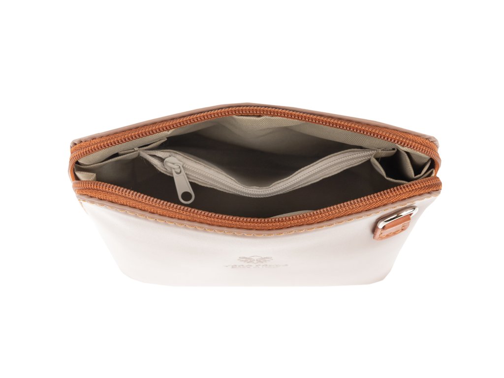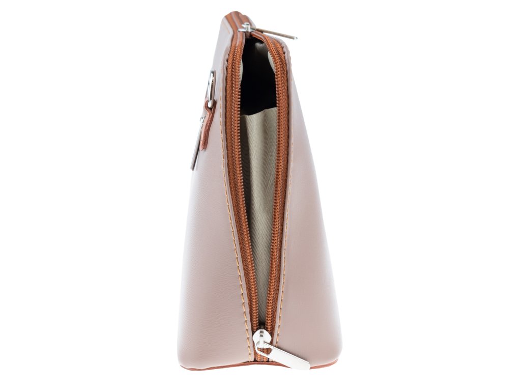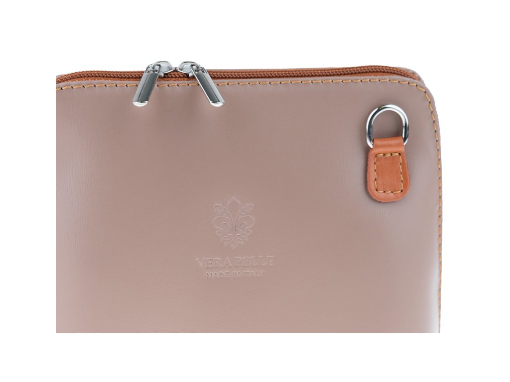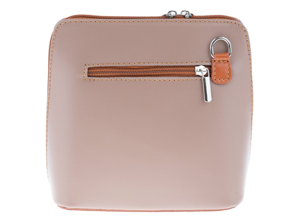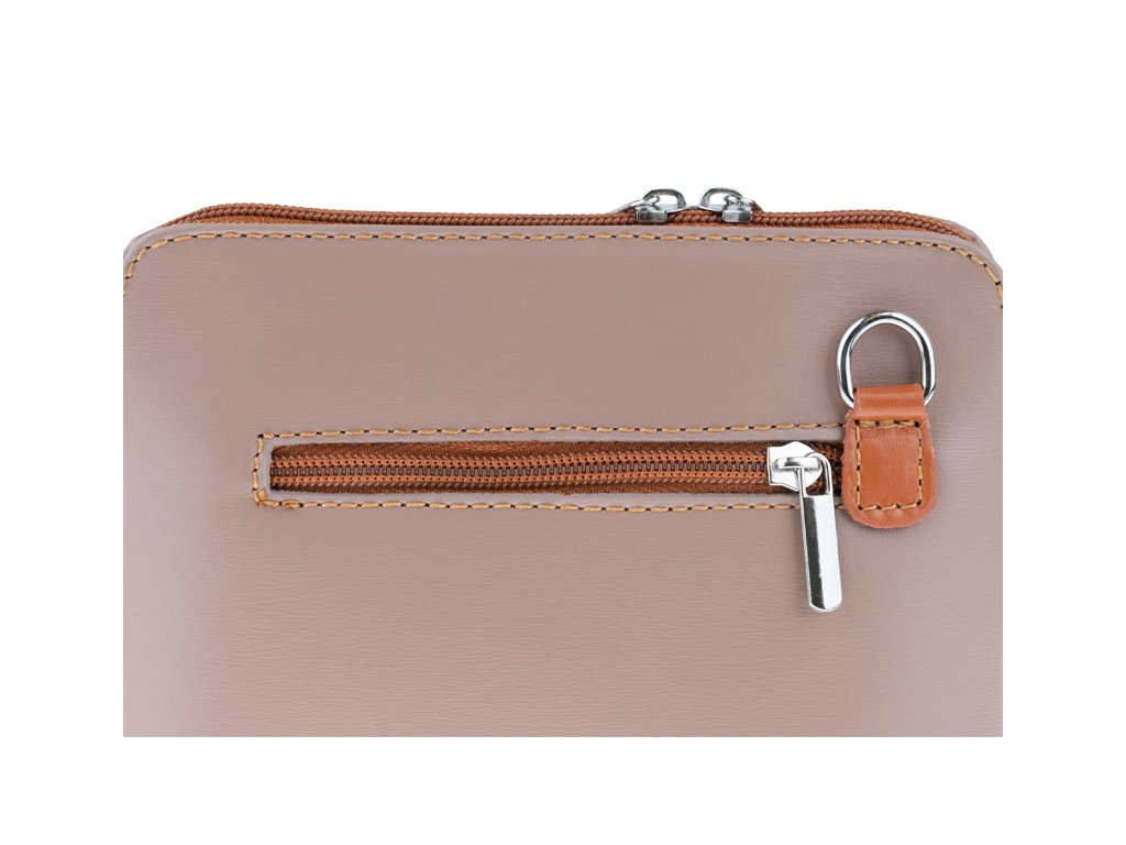 Elegantná, no zároveň veľmi praktická hnedá kabelka malých rozmerov vyrobená z pravej kože. Vďaka tenkému popruhu je nositeľná cez rameno. Zips, ktorým sa uzatvára, vedie po hrane kabelky až po spodný okraj na oboch stranách, a preto je jej vnútro dobre dostupné. Na vonkajšej zadnej strane nájdete na kabelke malé vrecko na zips a vo vnútri delí celý priestor na dve časti priečka, ktorá súčasne slúži ako vrecko na zips. Hĺbka jej dna je 8 cm.