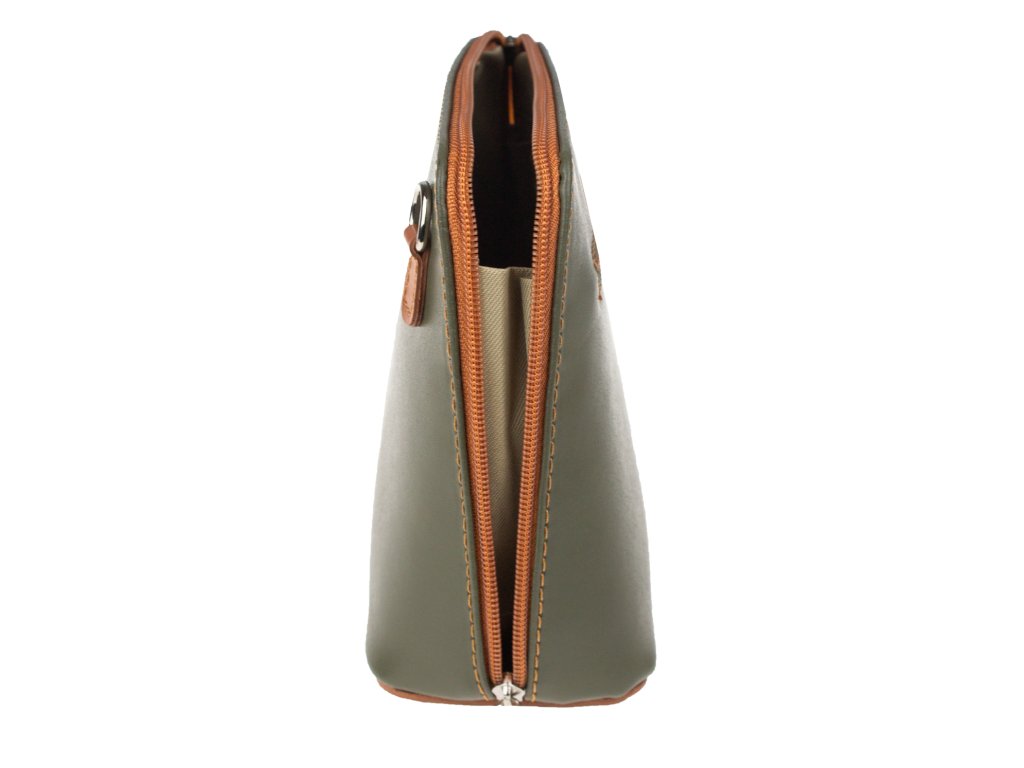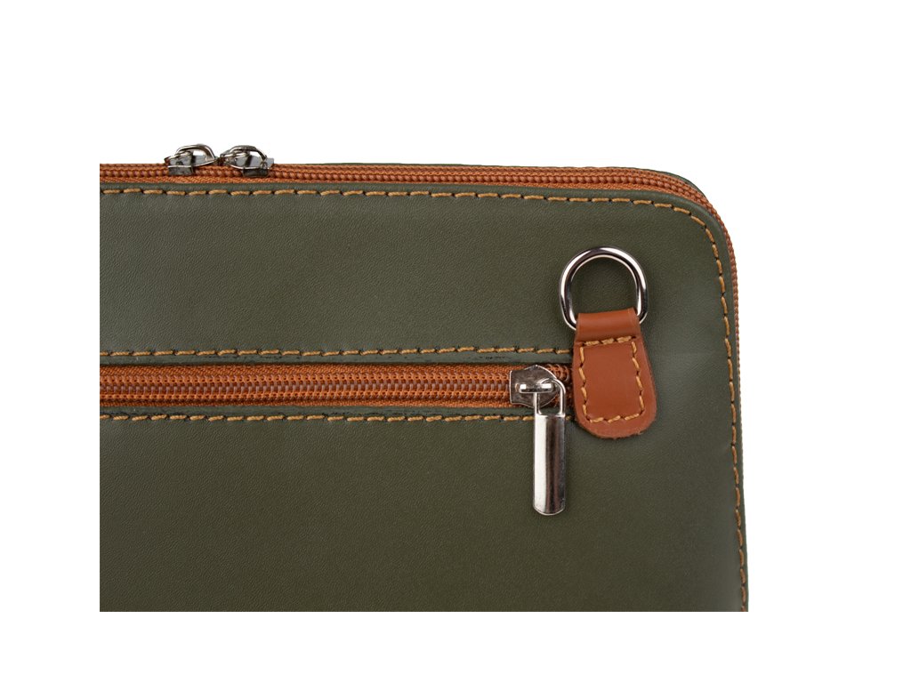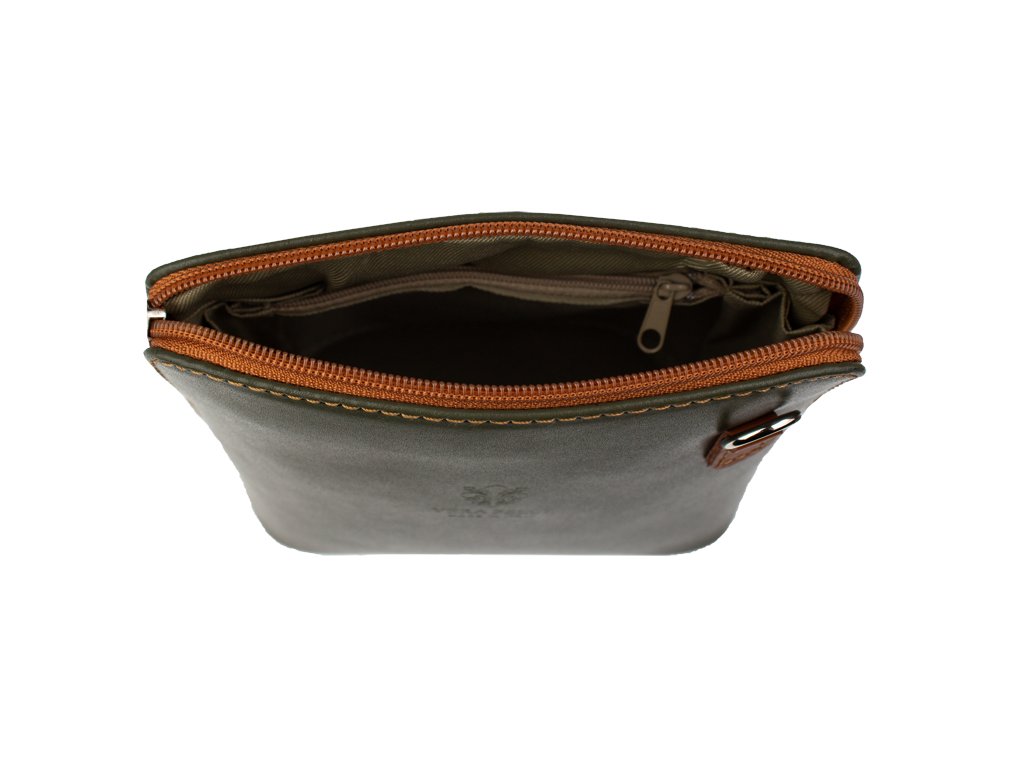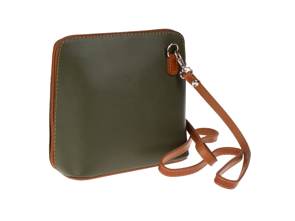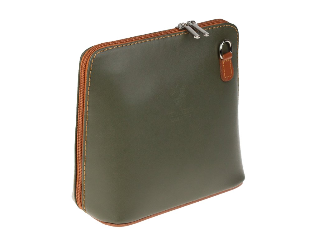 Elegantná, no zároveň veľmi praktická kabelka malých rozmerov v zelenej farbe vyrobená z pravej kože. Vďaka tenkému popruhu je nositeľná cez rameno. Zips, ktorým sa uzatvára, vedie po hrane kabelky až po spodný okraj na oboch stranách, a preto je jej vnútro dobre dostupné. Na vonkajšej zadnej strane nájdete na kabelke malé vrecko na zips a vo vnútri delí celý priestor na dve časti priečka, ktorá súčasne slúži ako vrecko na zips. Hĺbka jej dna je 8 cm. Dĺžka prídavného popruhu je cca 120 cm.