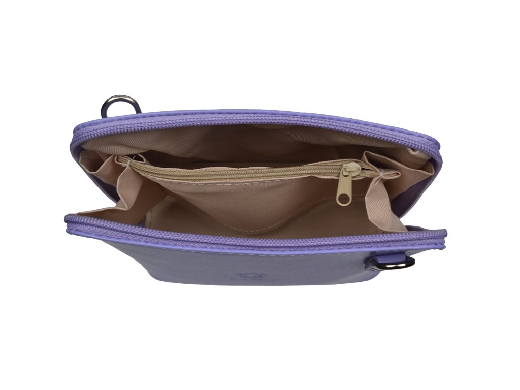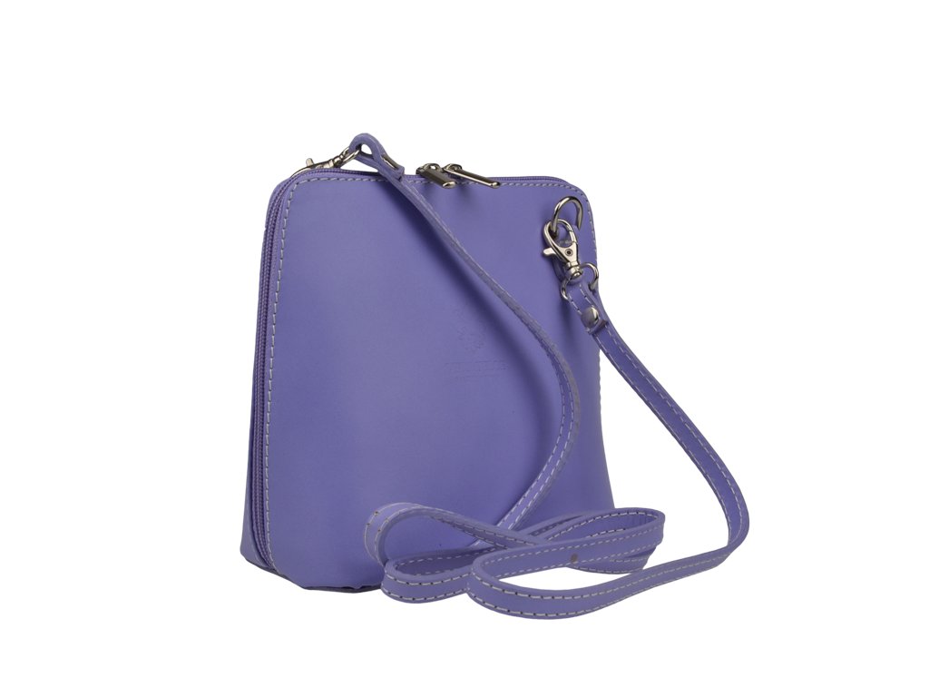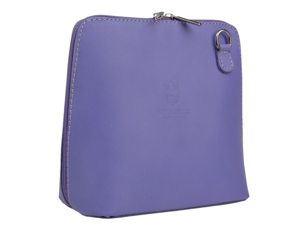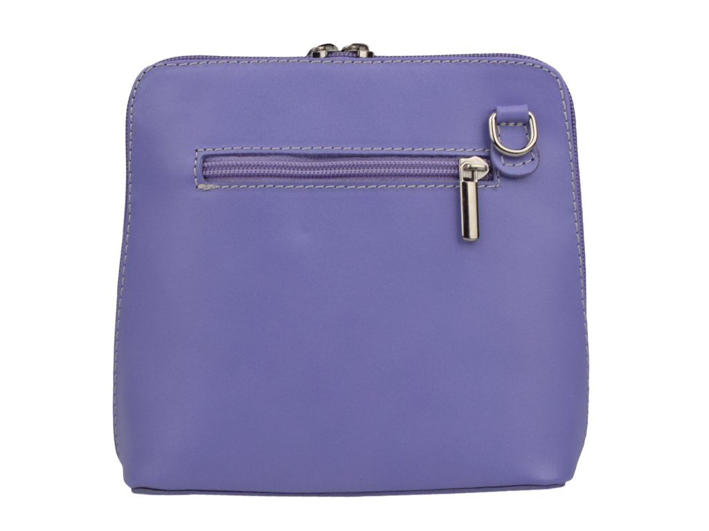 Elegantná, no zároveň veľmi praktická fialová kabelka malých rozmerov vyrobená z pravej kože. Vďaka tenkému popruhu je nositeľná cez rameno. Zips, ktorým sa uzatvára, vedie po hrane kabelky až po spodný okraj na oboch stranách, a preto je jej vnútro dobre dostupné. Na vonkajšej zadnej strane nájdete na kabelke malé vrecko na zips a vo vnútri delí celý priestor na dve časti priečka, ktorá súčasne slúži ako vrecko na zips. Hĺbka jej dna je 8 cm. Dĺžka prídavného popruhu je cca 120 cm.