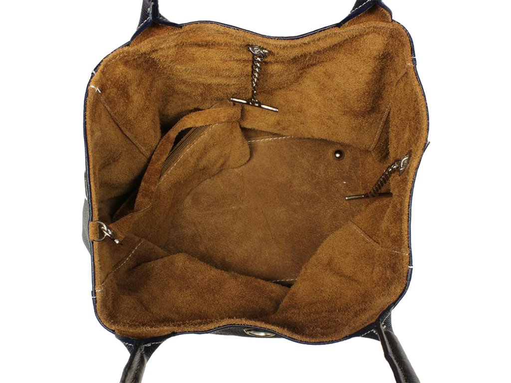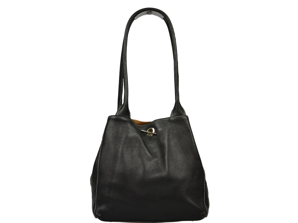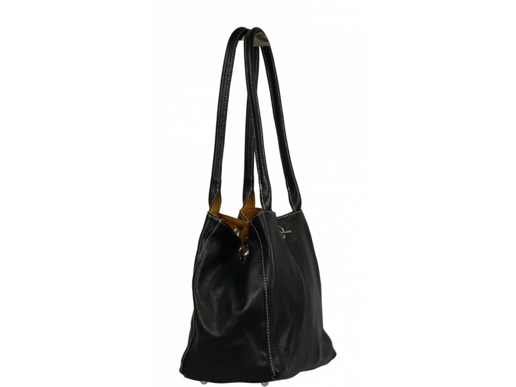 Čierna kabelka z pravej kože má jednoduchý, ale moderný dizajn. Kabelka sa zapína retiazkami, ktoré sú navzájom prekrížené a sú v striebornej farbe. Vo vnútri kabelky sa nachádza malé kožené vrecko na zips, ktoré môžete odopnúť. Je výnimočná tým, že je obojstranná. Kabelka je pomerne malých rozmerov, vhodná na bežné nosenie. Môžete ju nosiť v ruke, alebo si ju prehodiť cez rameno.