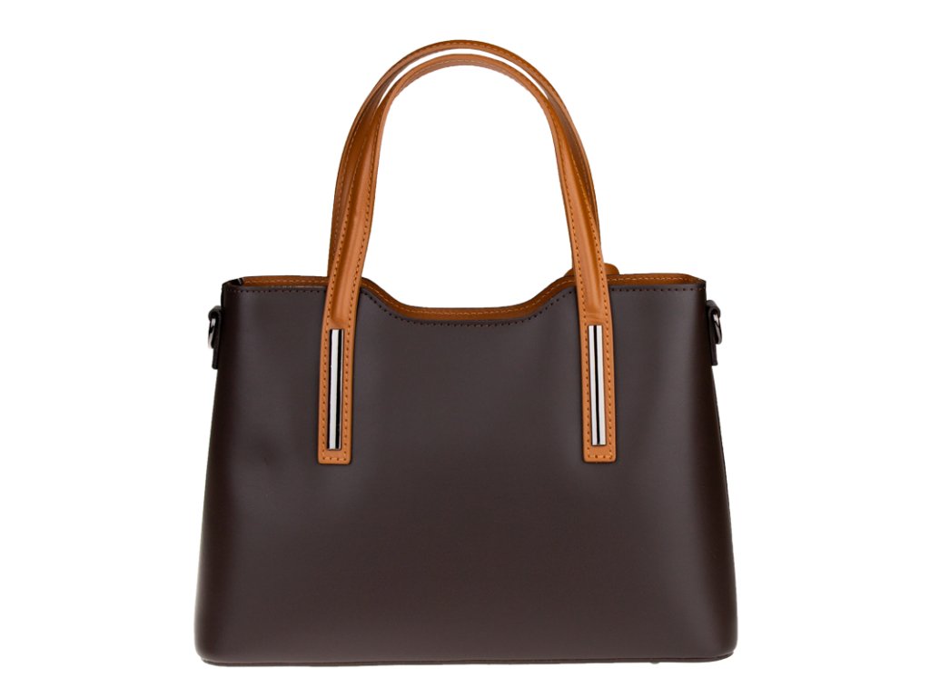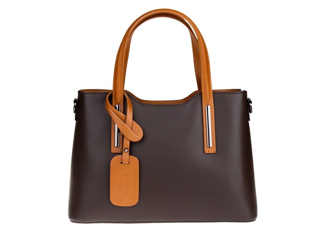 Rozkošná kabelka s jednoduchým, ale veľmi elegantným dizajnom v cafe farbe. Kabelka je vyrobená z prírodnej, pevnej a hladkej kože. Kabelka značky VERA PELLE sa uzatvára na zips. Vnútro kabelky disponuje priehradkou, ktorá slúži ako vrecko na zips, na bočných stenách nájdeme jedno malé vrecko na zips a dve otvorené vrecká na drobnosti.