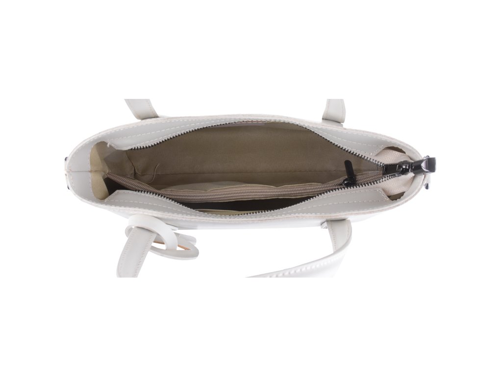Rozkošná kabelka s jednoduchým, ale veľmi elegantným dizajnom v béžovej farbe. Kabelka je vyrobená z prírodnej, pevnej a hladkej kože. Kabelka značky VERA PELLE sa uzatvára na zips. Vnútro kabelky disponuje priehradkou, ktorá slúži ako vrecko na zips, na bočných stenách nájdeme jedno malé vrecko na zips a dve otvorené vrecká na drobnosti.