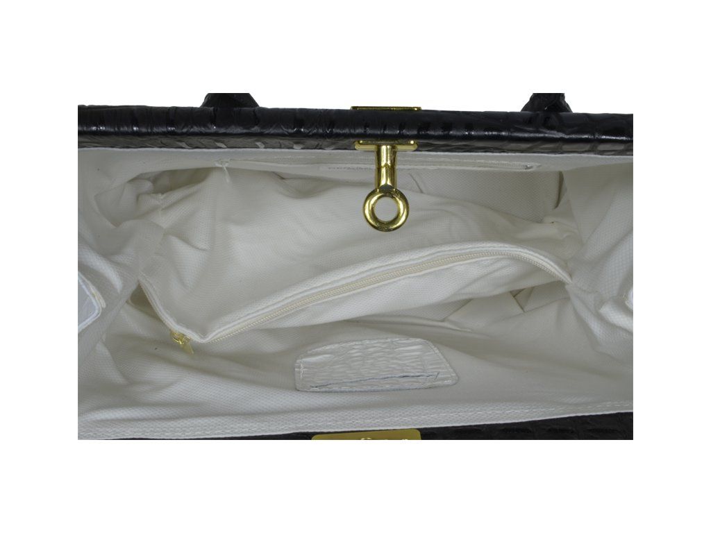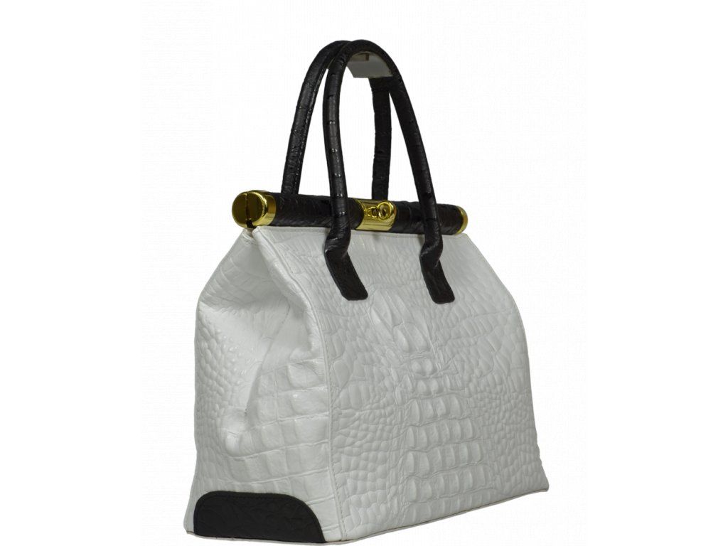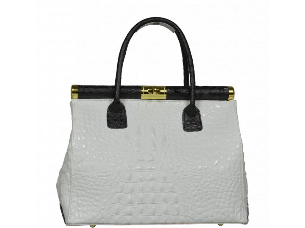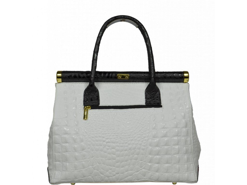 Bielo-čierna kožená kabelka je vyrobená z pravej kože s úpravou krokodílej textúry. Veľmi dobre si drží svoj tvar. Je vhodná na nosenie do ruky. Uzatvára sa pomocou patentu, v prípade potreby je možné kabelku uzamknúť malým priloženým zámkom. Na vonkajšej zadnej strane kabelky sa nachádza praktické uzatvárateľné vrecko. Vo vnútri nájdete vrecko na zips a dve malé priehradky vhodné napr. pre mobil alebo peňaženku. V strede je vrecko na zips, ktoré delí vnútro kabelky na dva priestory. Hĺbka jej dna je 15 cm.