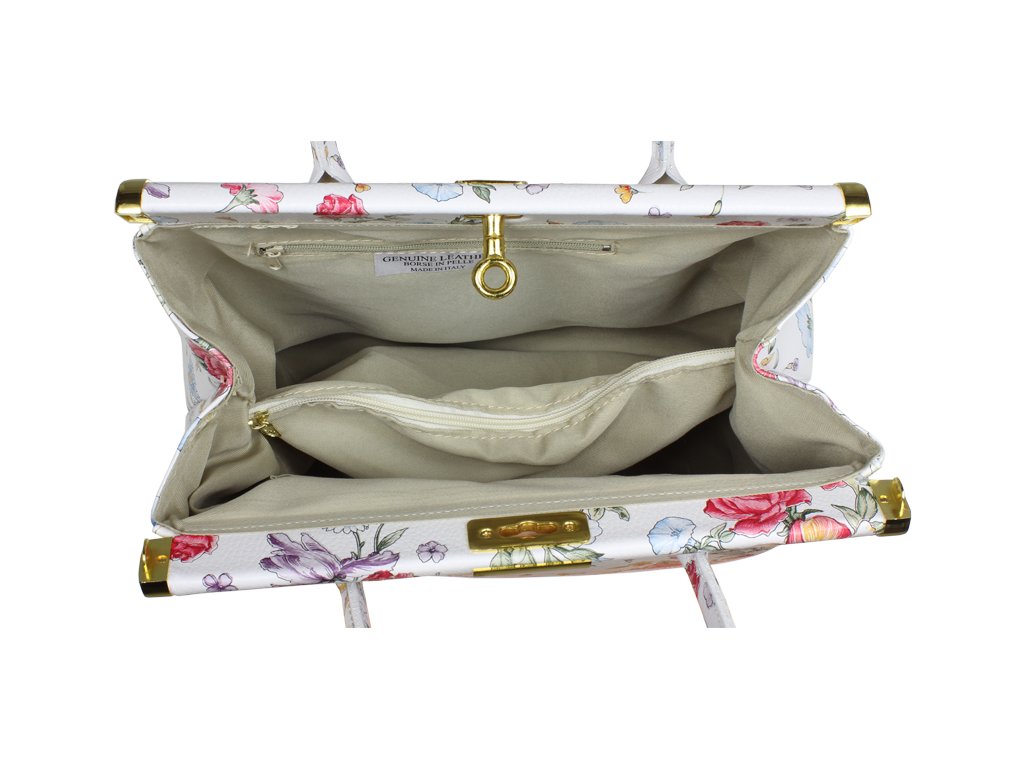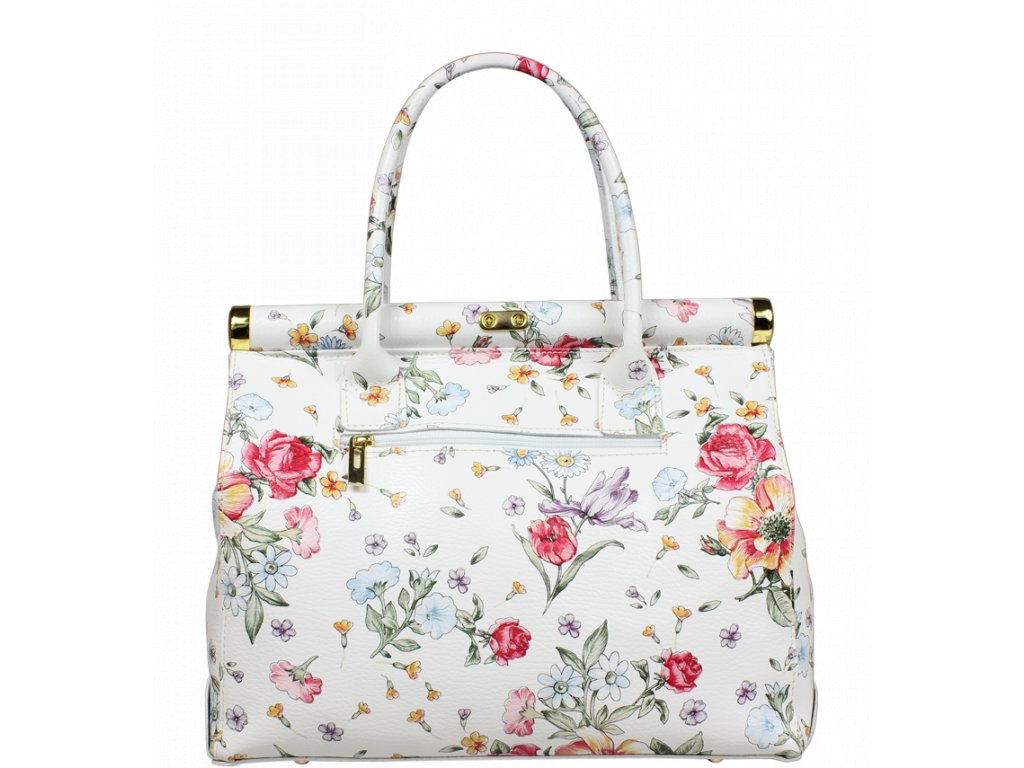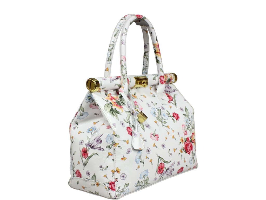 Biela kožená kabelka je vyrobená z pravej kože s kvetinovou textúrou. Veľmi dobre si drží svoj tvar. Je vhodná na nosenie do ruky, prípadne môžete využiť prídavný popruh - cca 97 cm, ktorý je súčasťou balenia. Uzatvára sa pomocou patentu, v prípade potreby je možné kabelku uzamknúť malým priloženým zámkom. Na vonkajšej zadnej strane kabelky sa nachádza praktické uzatvárateľné vrecko. Vo vnútri nájdete vrecko na zips a dve malé priehradky vhodné napr. pre mobil alebo peňaženku. V strede je vrecko na zips, ktoré delí vnútro kabelky na dva priestory. Hĺbka jej dna je 15 cm.