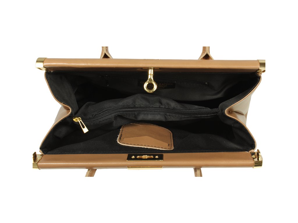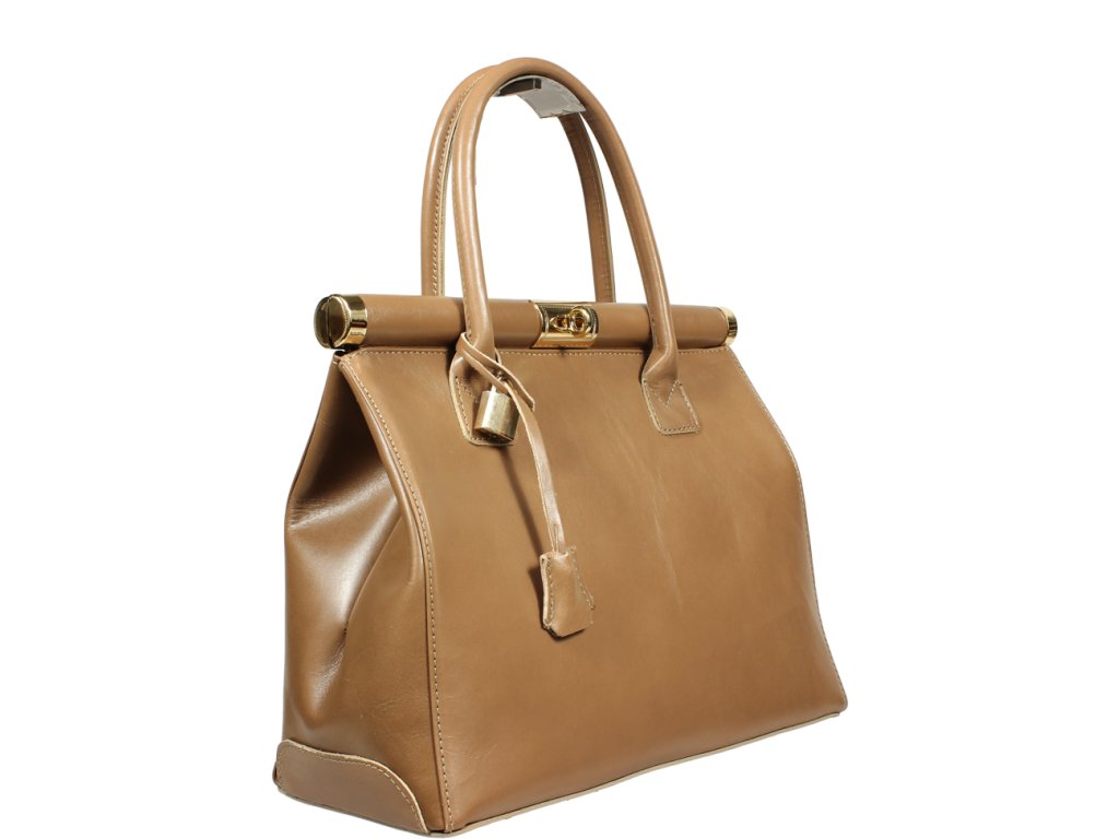 Hnedá kožená kabelka, ktorá je vďaka svojmu klasickému designu nazývaná i "doktorská". Je vyrobená z pravej kože s hladkou úpravou a veľmi dobre drží svoj tvar. Uzatvára sa pomocou patentu a je možné ju uzamknúť priloženým drobným zámkom. Je vhodná na nosenie do ruky. Súčasťou balenia je i prídavný popruh - cca 97 cm. Na vonkajšej zadnej strane má kabelka malé vrecko na zips. Vnútro kabelky je rozdelené veľkým uzatvárateľným vreckom na dve časti a po stranách disponuje dvomi malými priehradkami a jedným vreckom na zips. Hĺbka jej dna je 15 cm.