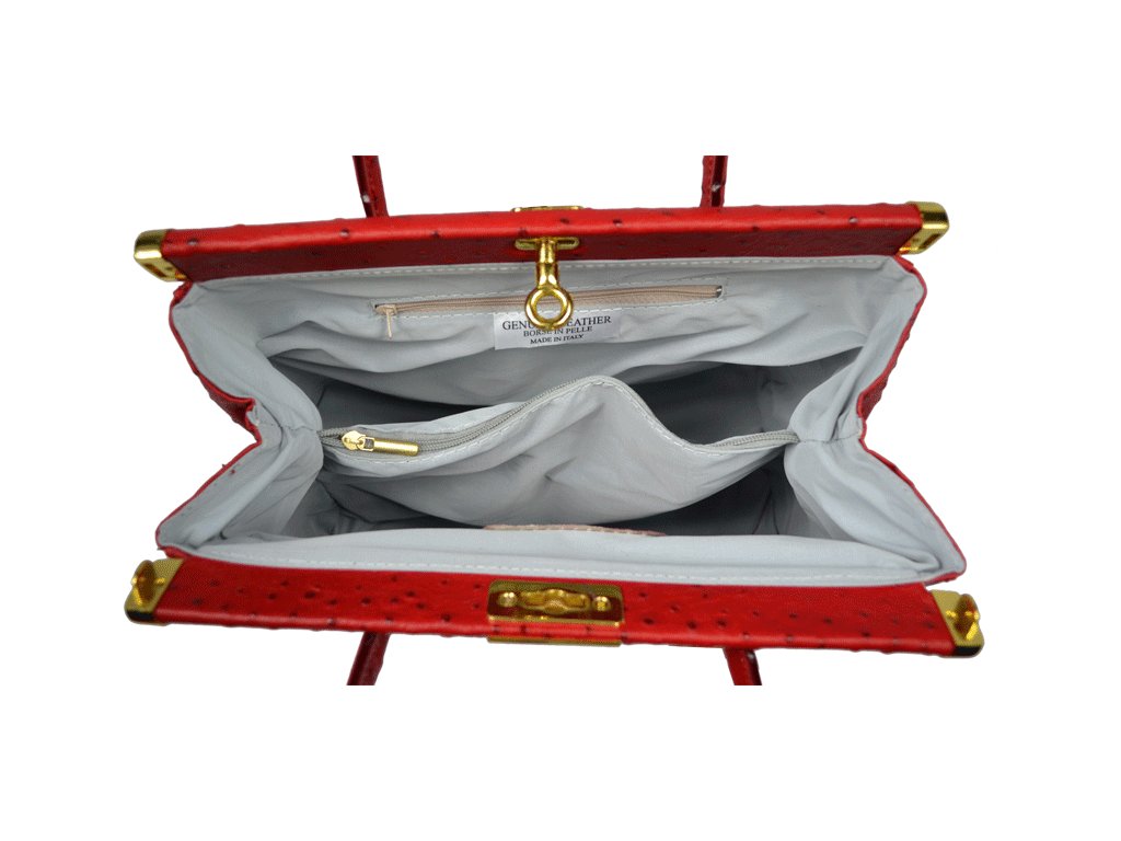 Táto "doktorská" kabelka Vás okrem svojho klasického designu zaujme tým, že dobre drží svoj tvar. Je vyrobená z pravej červenej kože s úpravou pštrosej textúry. Je vhodná na nosenie do ruky a je možné využiť i prídavný popruh - cca 97 cm, ktorý je súčasťou balenia. Vo vnútri nájdete dve malé uzatvárateľné vrecká a dve praktické otvorené priehradky. Na vonkajšej strane kabelky sa okrem toho nachádza ešte jedno vrecko na zips. Hĺbka jej dna je 15 cm.