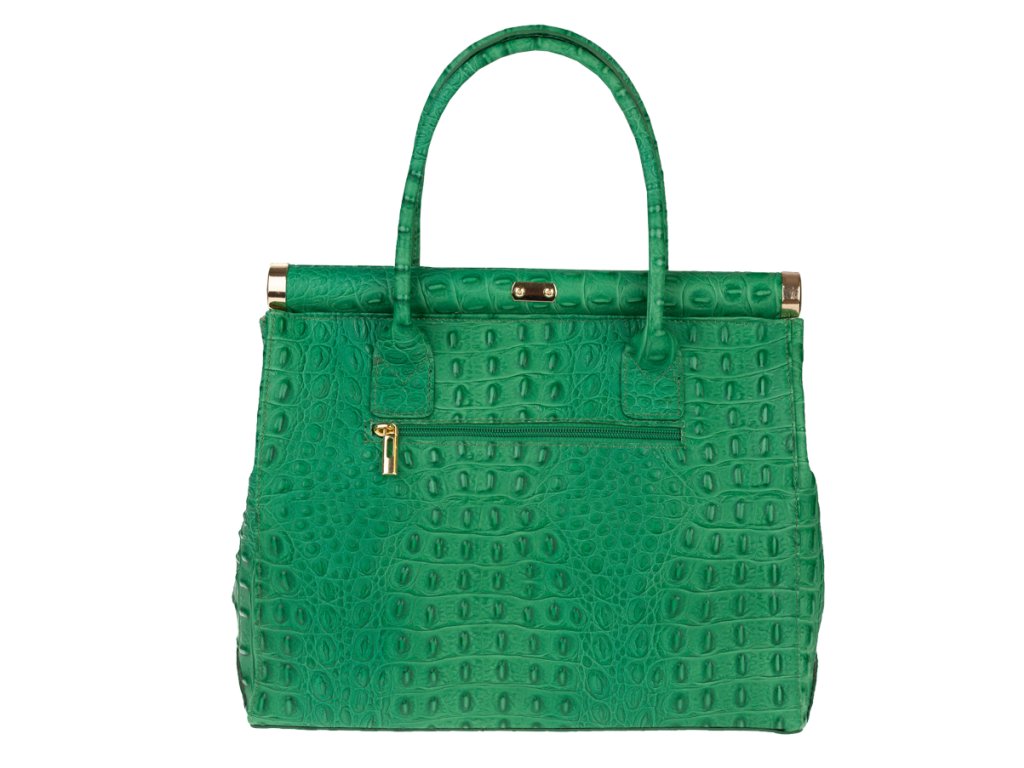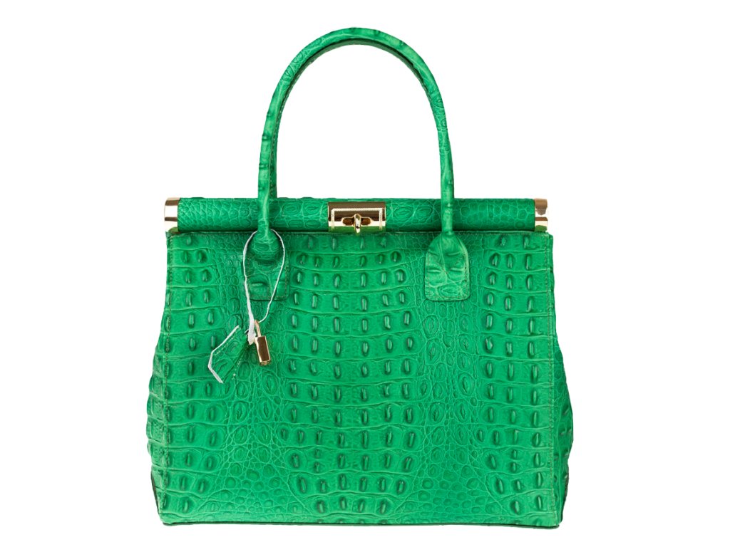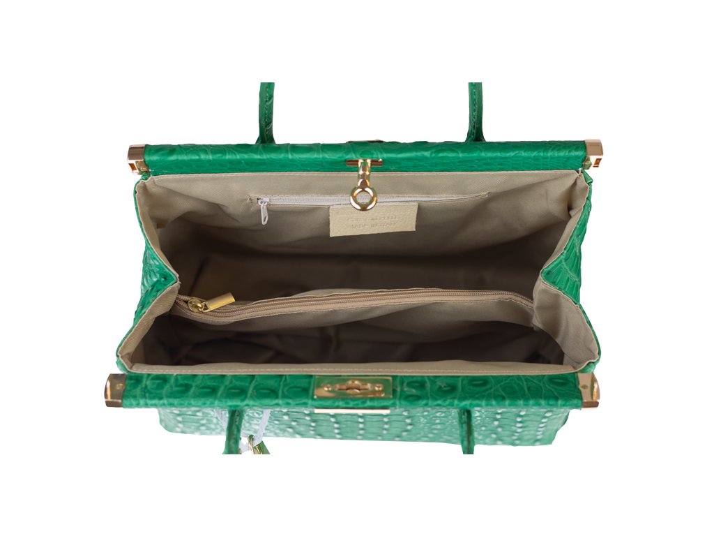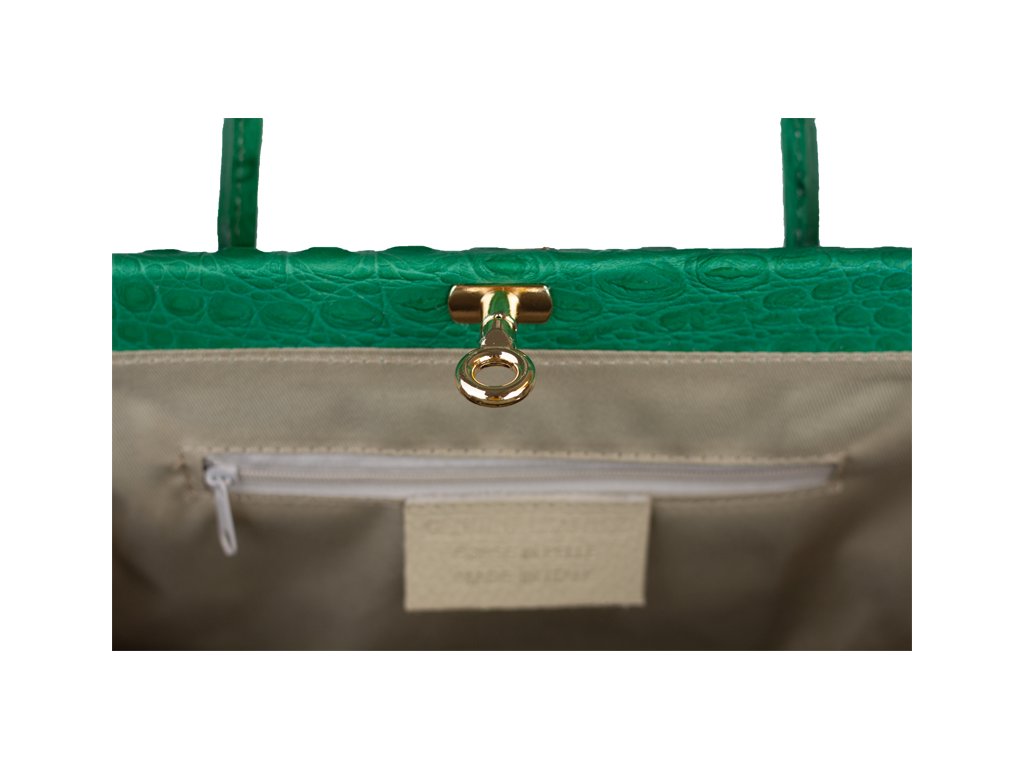 Klasická "doktorská" kabelka vo svetlom odtieni zelené farby. Je vyrobená z pravej kože s úpravou krokodílej textúry a veľmi dobre si drží svoj tvar. Je vhodná na nosenie do ruky, prípadne je možné využiť popruh - cca 100 cm, ktorý je súčasťou balenia. Vo vnútri kabelky sa nachádzajú dve malé priehradky a dve vrecká na zips. Na vonkajšej strane má kabelka tiež jedno malé praktické vrecko na zips. Hĺbka jej dna je 15 cm.