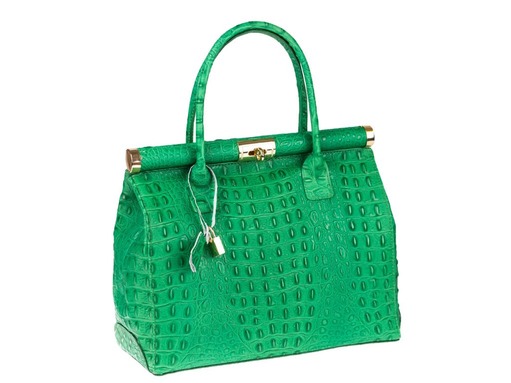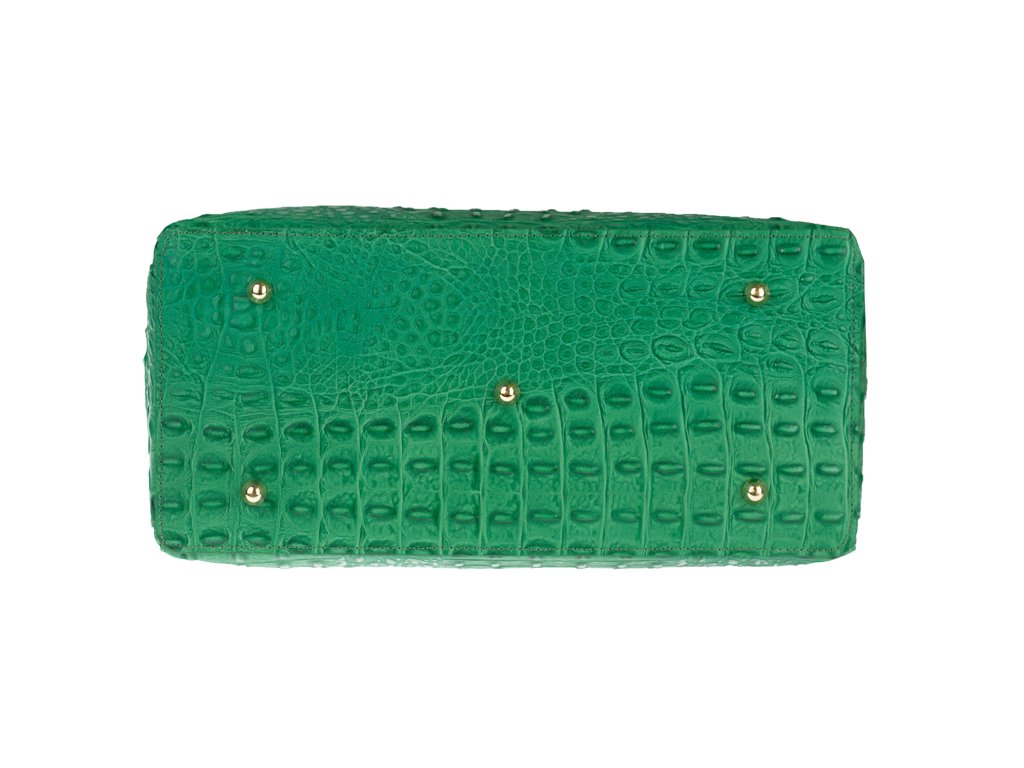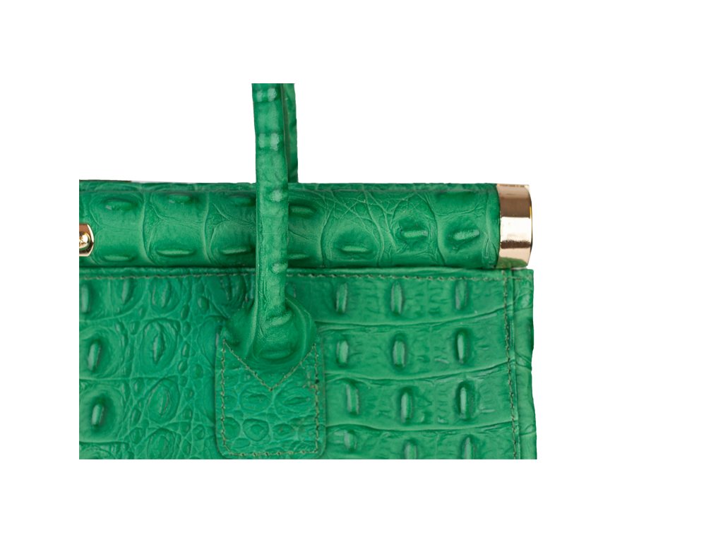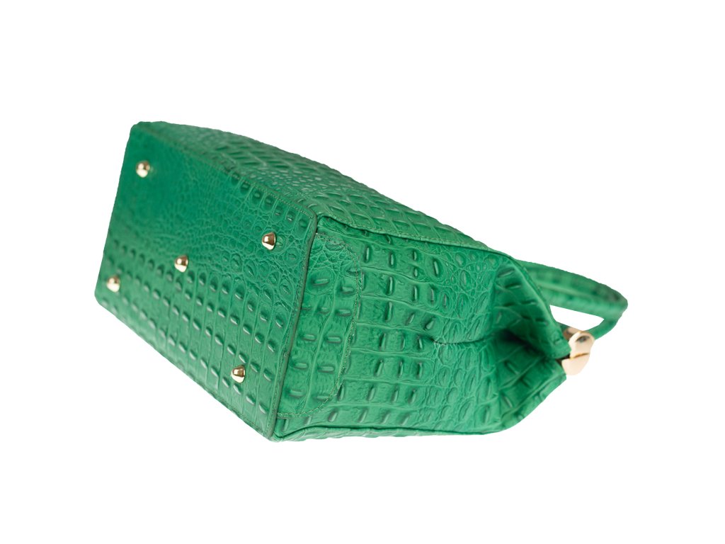 Klasická "doktorská" kabelka vo svetlom odtieni zelené farby. Je vyrobená z pravej kože s úpravou krokodílej textúry a veľmi dobre si drží svoj tvar. Je vhodná na nosenie do ruky, prípadne je možné využiť popruh - cca 100 cm, ktorý je súčasťou balenia. Vo vnútri kabelky sa nachádzajú dve malé priehradky a dve vrecká na zips. Na vonkajšej strane má kabelka tiež jedno malé praktické vrecko na zips. Hĺbka jej dna je 15 cm.