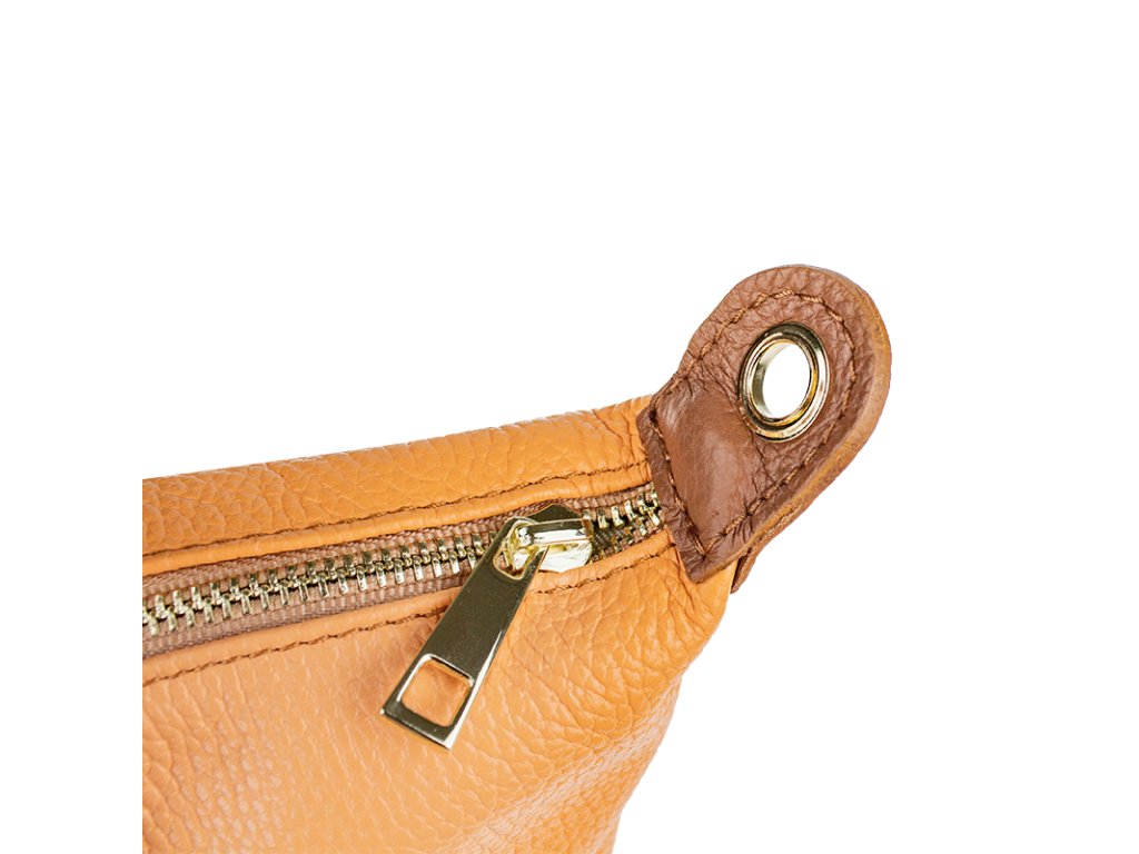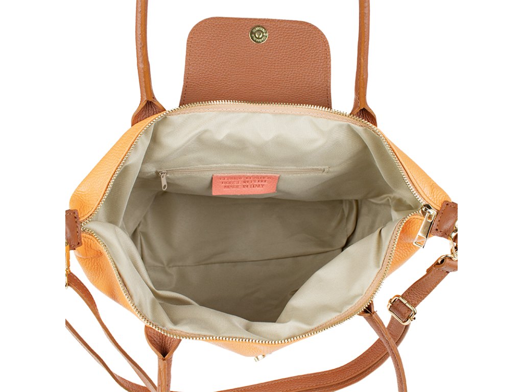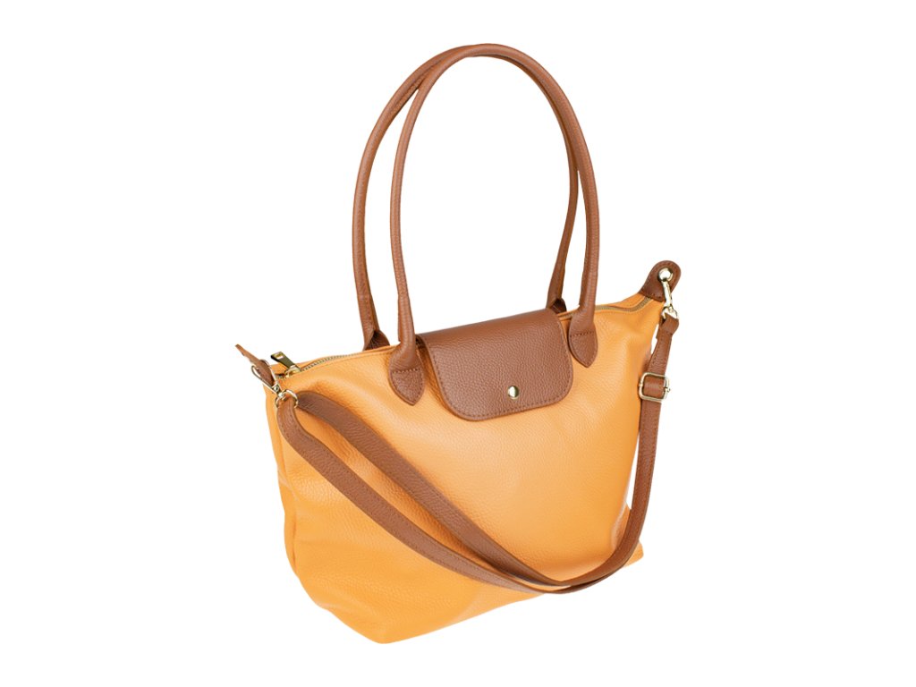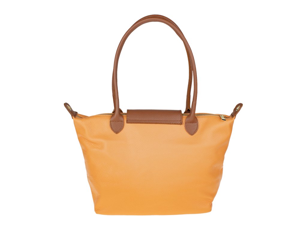 Kožená a priestranná kabelka v marhuľovej farbe. Jednoduchý dizajn a množstvo priestoru z nej vytvára praktickú tašku, ktorá je vhodná na každodenné nosenie, do práce alebo školy. Vnútro kabelky disponuje vreckom na zips. Popruh 120 cm.