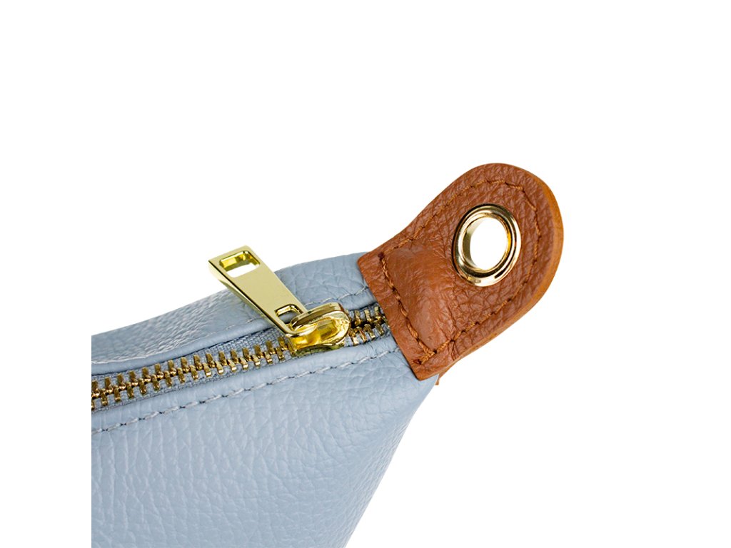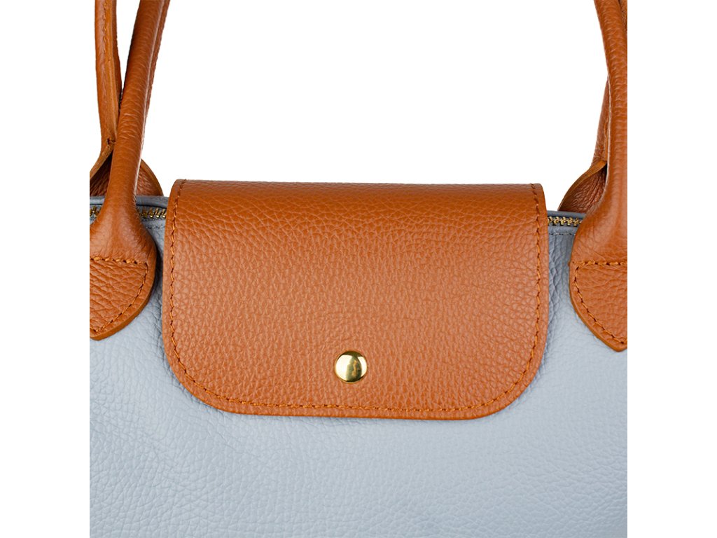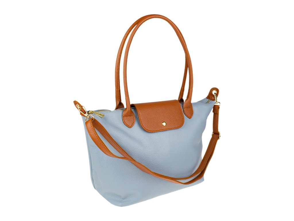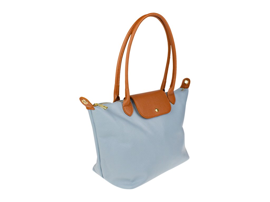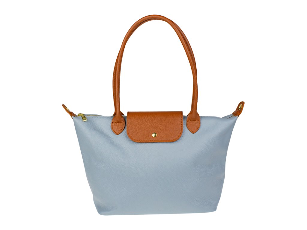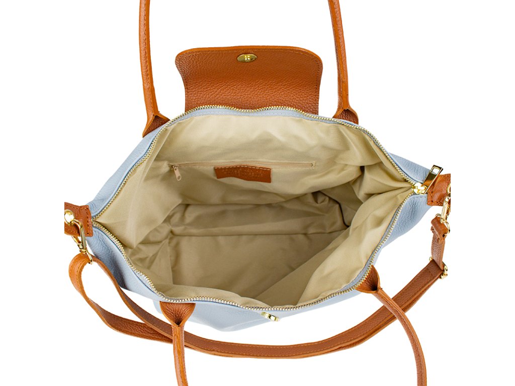 Kožená a priestranná kabelka modrej farbe. Jednoduchý dizajn a množstvo priestoru z nej vytvára praktickú tašku, ktorá je vhodná na každodenné nosenie, do práce alebo školy. Vnútro kabelky disponuje vreckom na zips. Popruh 120 cm.