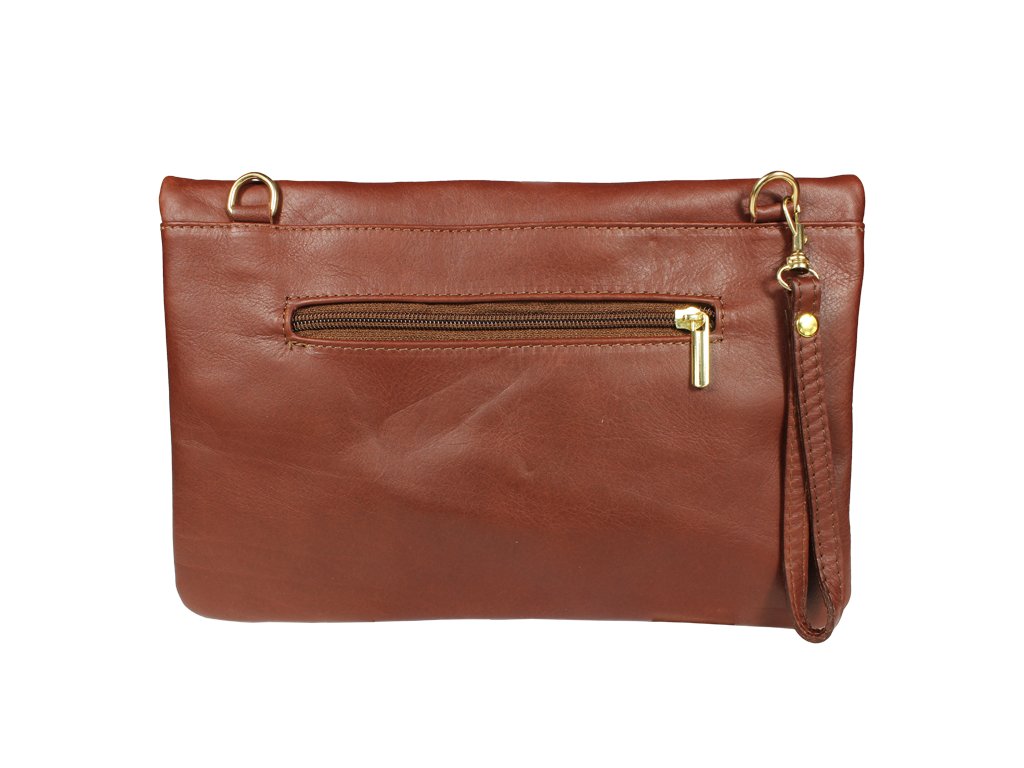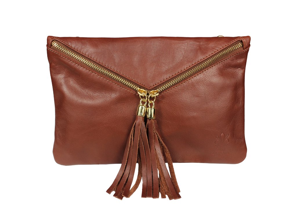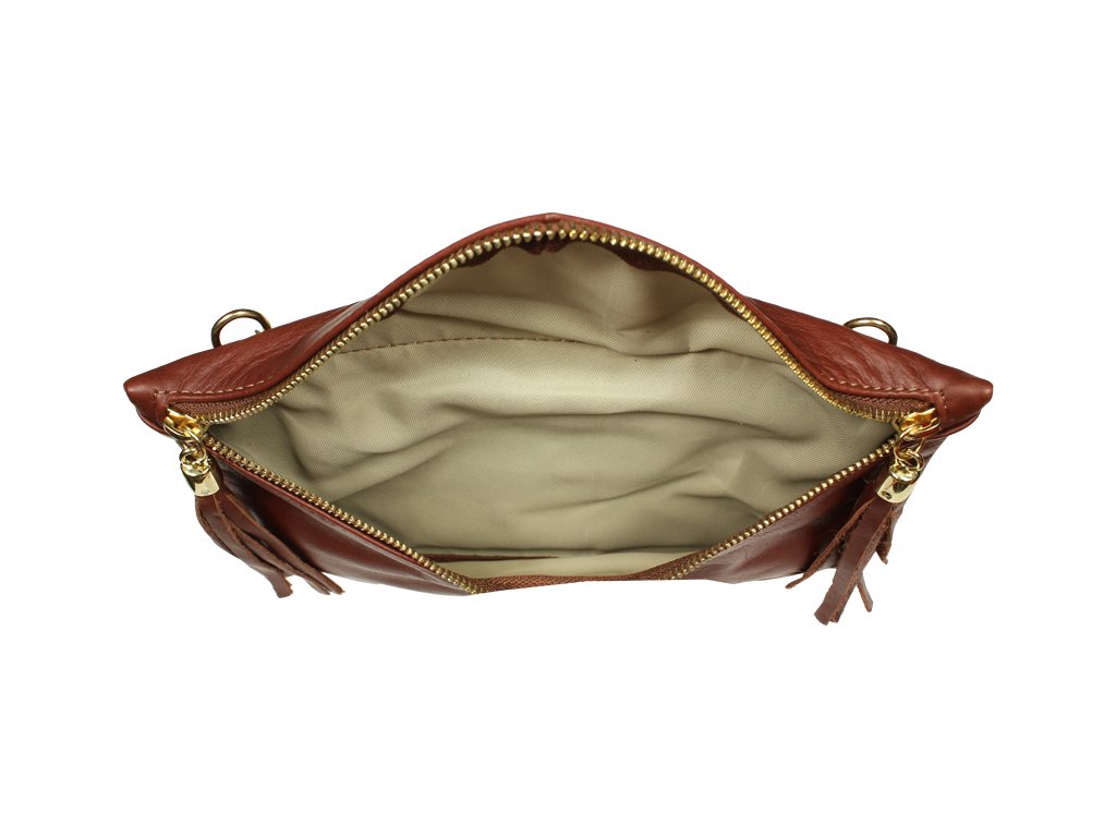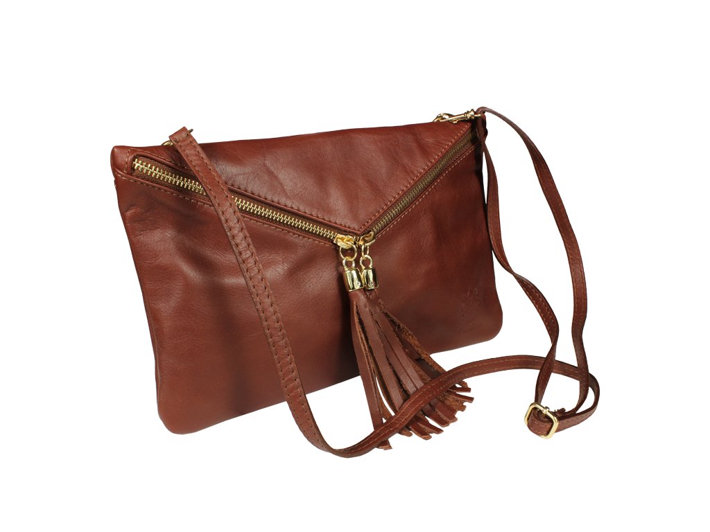 Táto moderná hnedá listová kabelka už na prvý pohľad zaujme kombináciou dômyselne tvarovaného zipsu a ozdobných strapcov. Je vyrobená z príjemnej mäkkej kože a je možné ju nosiť nielen v ruke, ale i cez rameno – s použitím prídavného popruhu. Kabelka je veľmi praktická, čo iste oceníte napr. pri bežnom nosení alebo na párty.