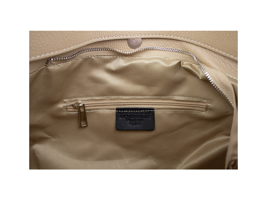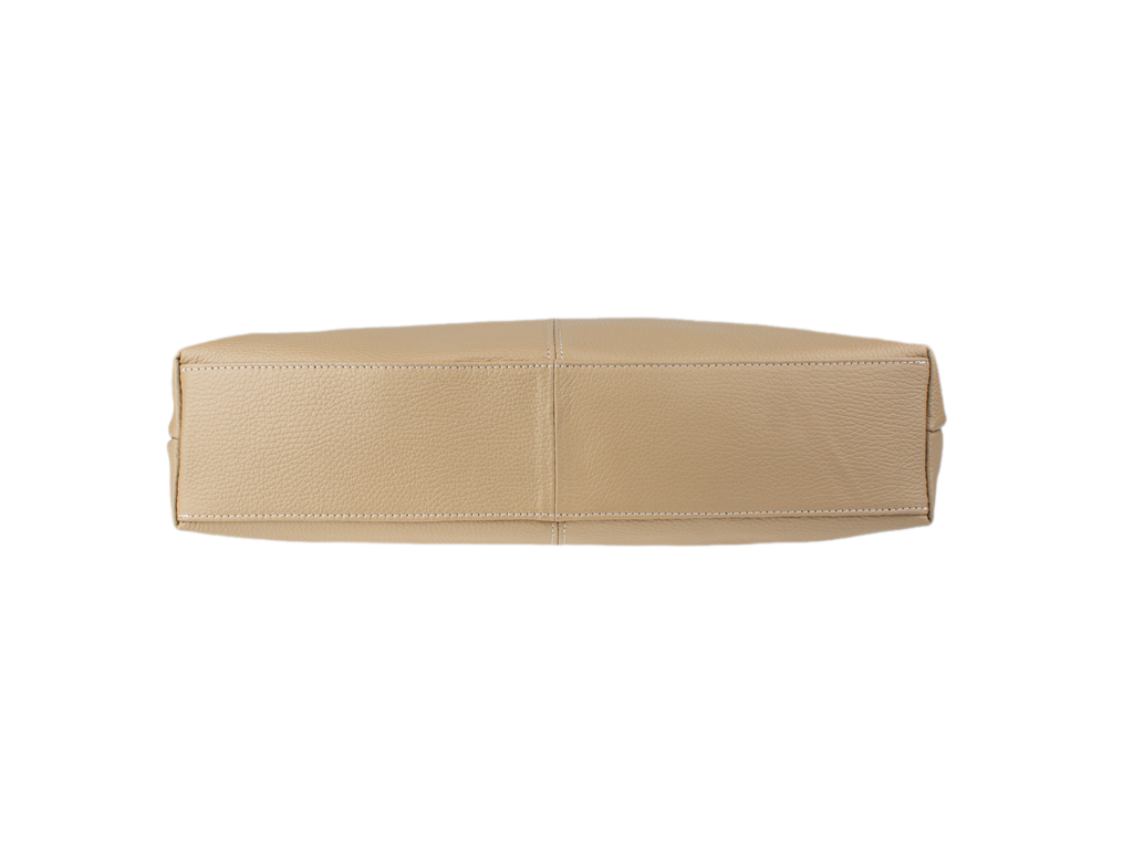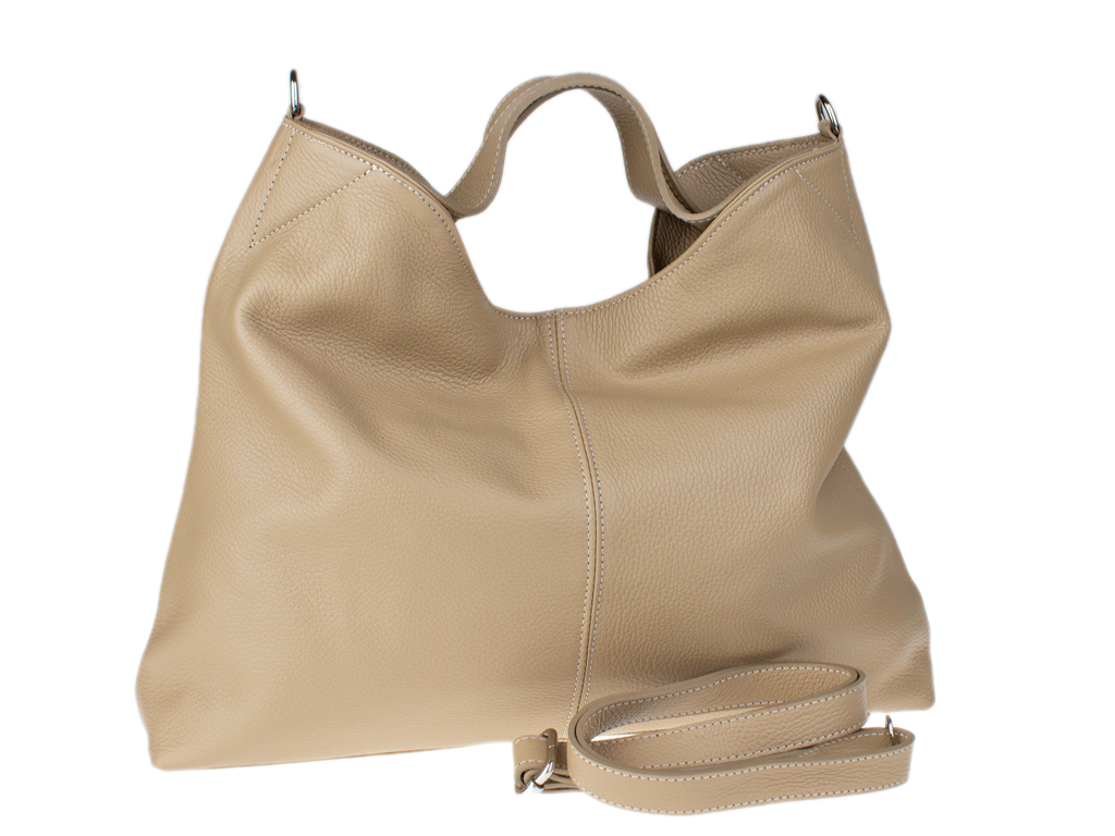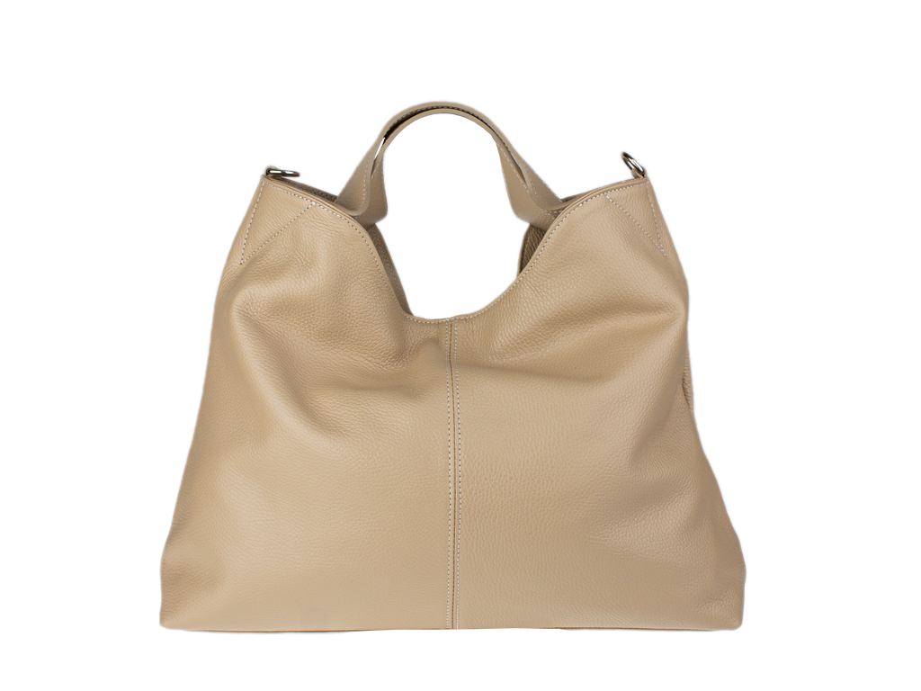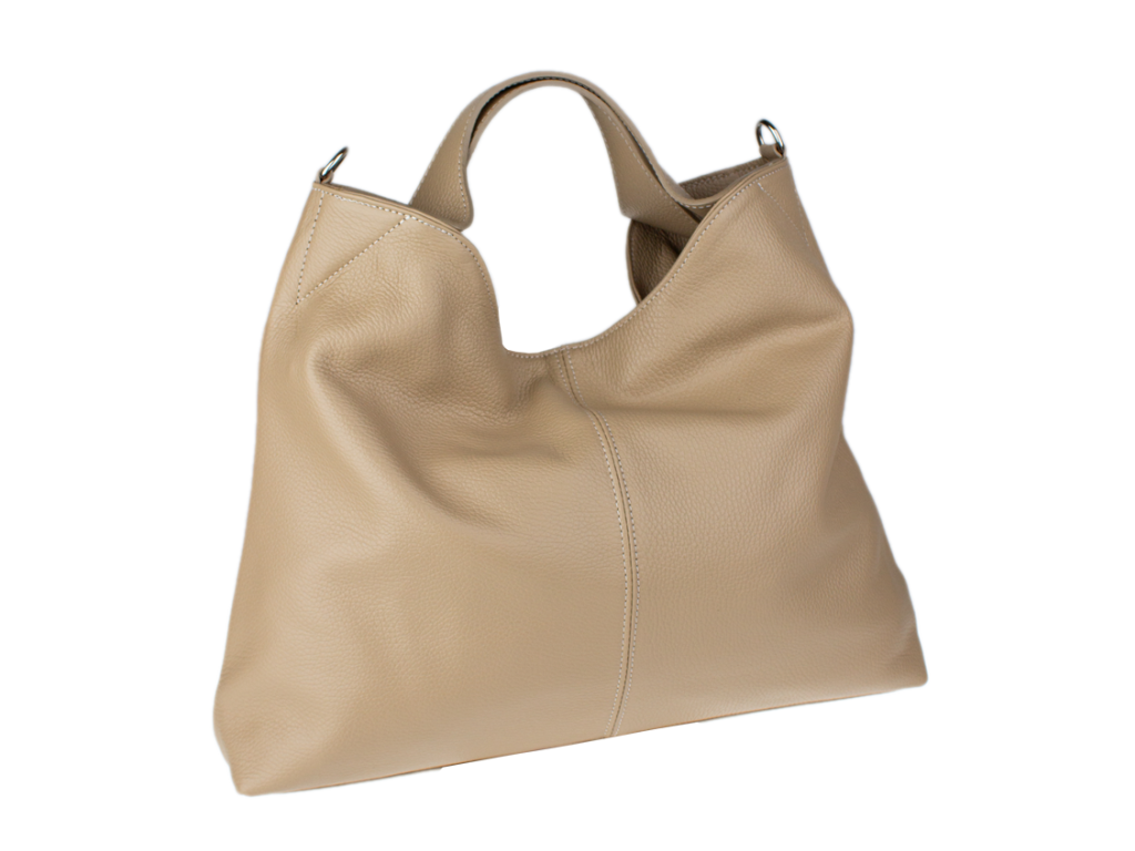 Hľadáte dokonalú rovnováhu medzi štýlom a praktickosťou? Táto priestranná dámska kabelka typu "hobo" je vyrobená z prvotriednej pravej kože s jemnou zrnitou textúrou, ktorá jej dodáva luxusný vzhľad a mimoriadnu odolnosť. Jej nadčasový dizajn v elegantnom odtieni béžovej sa ľahko kombinuje s pracovným kostýmom aj voľnočasovým outfitom.