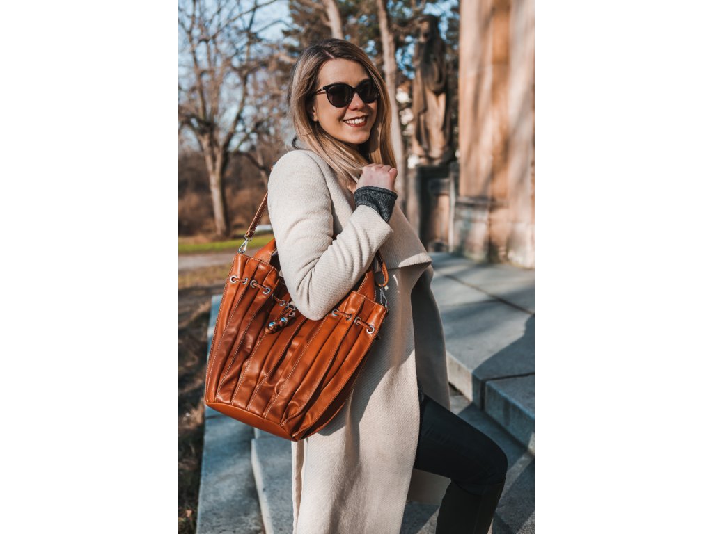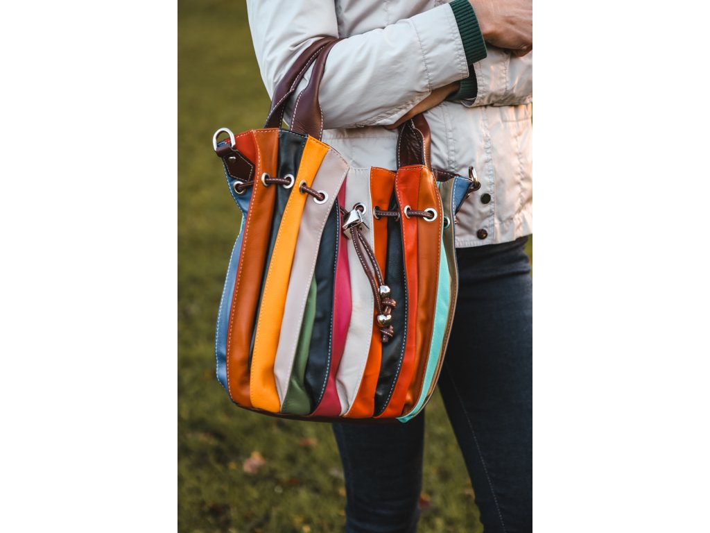 Krásna farebná kabelka s jedinečným designom. Je vyrobená z pravej poctivej kože a je vhodná na nosenie cez rameno. V prípade potreby je možné využiť prídavný nastaviteľný popruh dlžky 120 cm, ktorý je súčasťou balenia. Kabelka sa uzatvára pomocou magnetickej patentky a vo vnútri okrem dostatočného priestoru disponuje malým uzatvárateľným vreckom a dvomi priehradkami, napr. pre Váš mobli alebo kľúče.