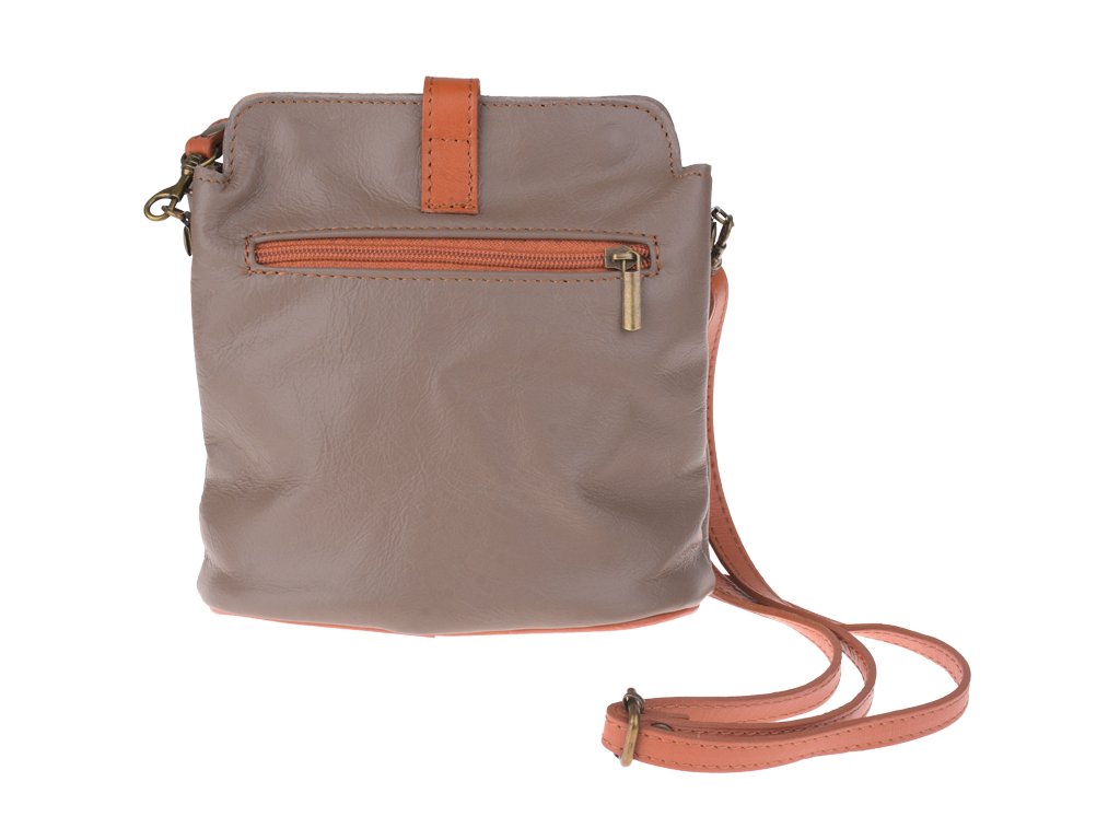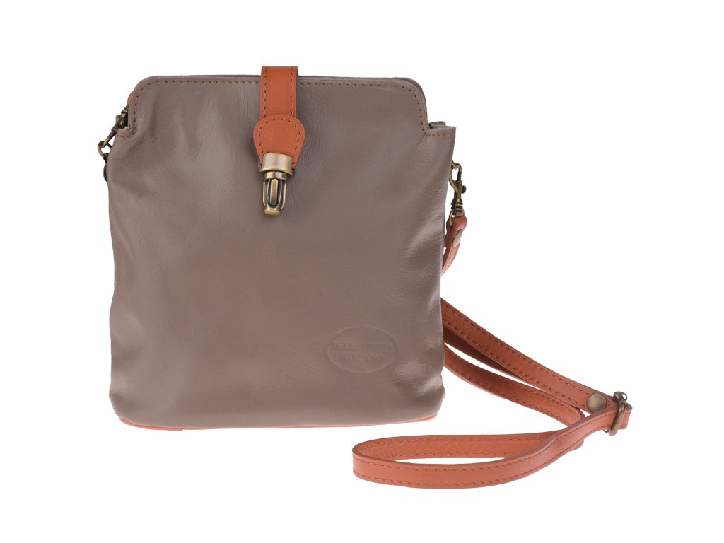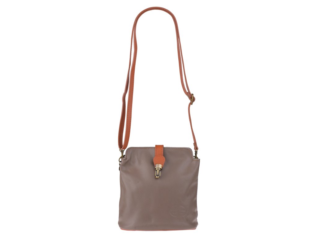 Malá praktická kabelka v hnedej farbe s jednoduchým designom vyrobená z pravej hladkej kože. Kabelka disponuje dômyselným uzatváraním, ktoré sa skladá jednak z dvoch patentiek spájajúcich obe strany kabelky, a jednak z prúžku na vonkajšej strane kabelky zakončeného uzatváracím patentom. Vďaka nastaviteľnému popruhu s dĺžkou cca 120 cm je táto kabelka vhodná na nosenie cez rameno. Z vonkajšej i vnútornej strany má kabelka malé vrecko na zips. Hĺbka jej dna je 9 cm.
