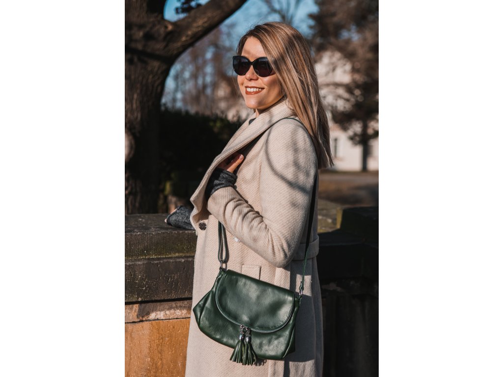 Kabelka vyrobená z pravej mäkkej kože. Poklop kabelky s ozdobným zipsom a príveskom slúži ako vrecko. Nosí sa cez rameno a po predĺžení popruhu ju možete nosiť crossbody (krížom). Kabelka sa uzatvára pomocou patentky a vnútorná priehradka sa uzatvára na zips. Dĺžka popruhu je 120 cm.