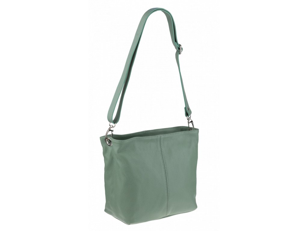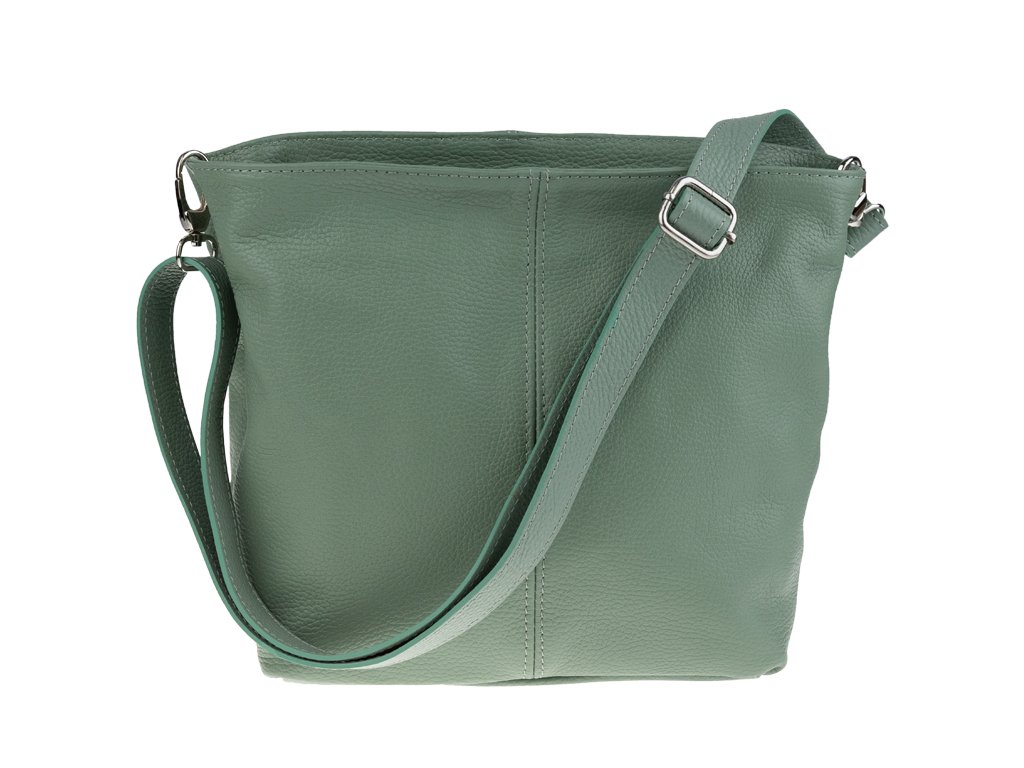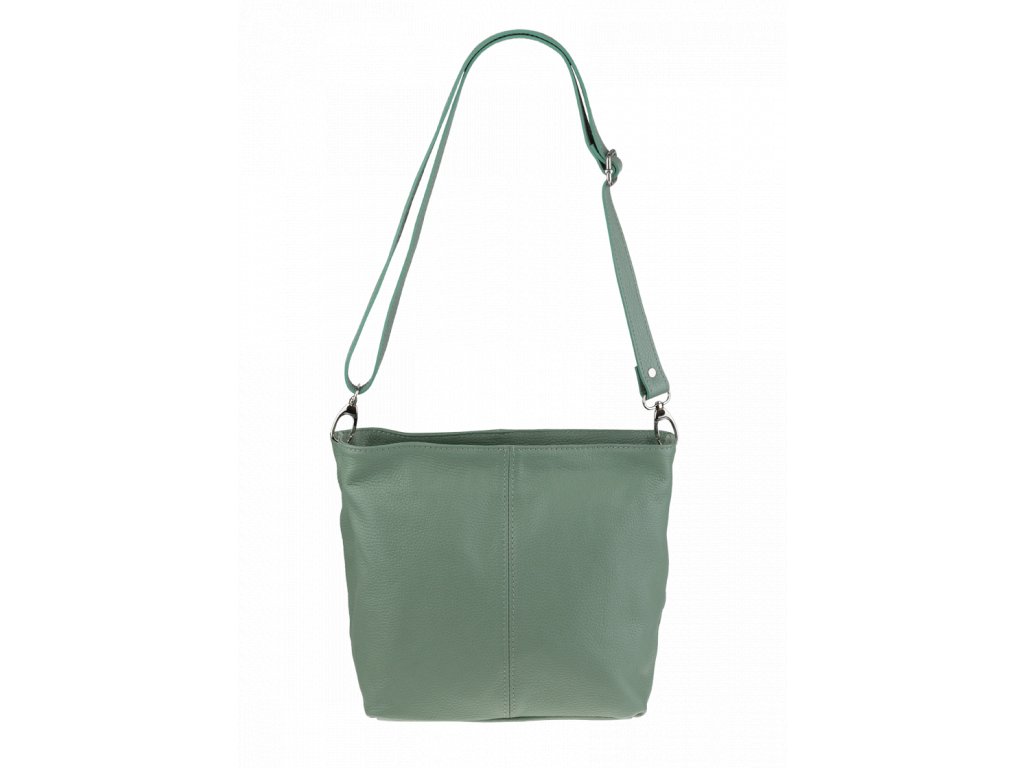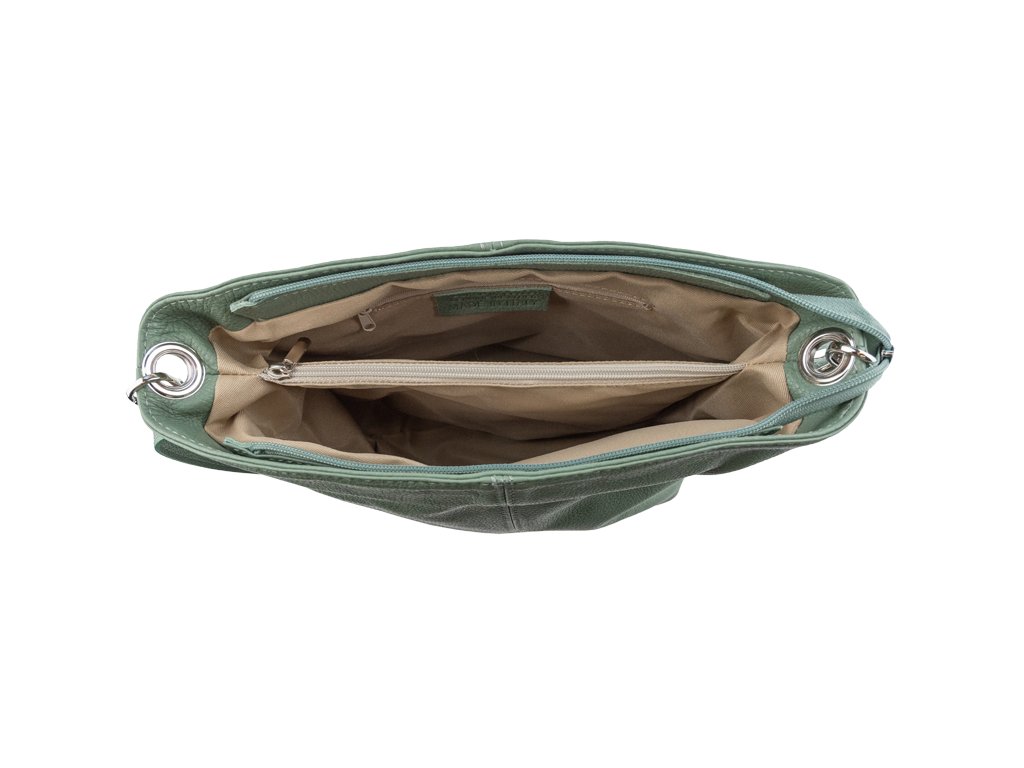 Praktická zelená kabelka uzatvárateľná na zips, nositeľná cez rameno alebo cross-body (krížom). Vo vnútri disponuje priečkou, ktorá zároveň slúži ako úložná priehradka so zipsom a na bočnej stene sa nachádza ďalšie zipsovacie vrecko. Hĺbka jej dna je 13 cm.