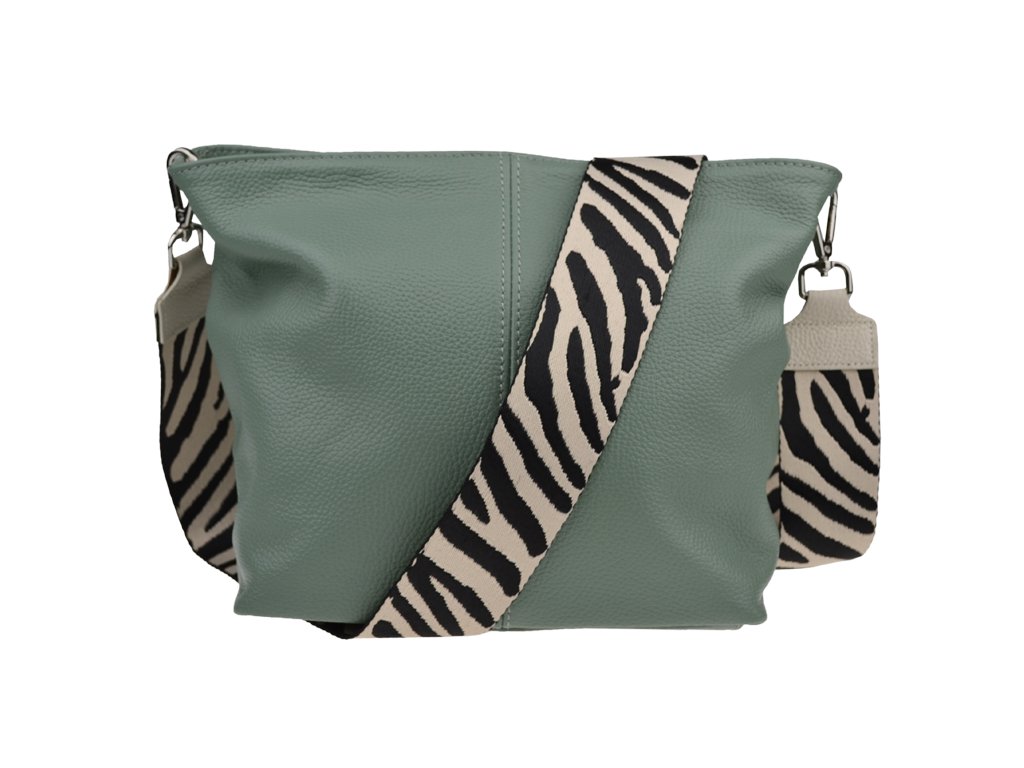 Praktická zelená kabelka uzatvárateľná na zips, nositeľná cez rameno alebo cross-body (krížom). Vo vnútri disponuje priečkou, ktorá zároveň slúži ako úložná priehradka so zipsom a na bočnej stene sa nachádza ďalšie zipsovacie vrecko. Hĺbka jej dna je 13 cm.