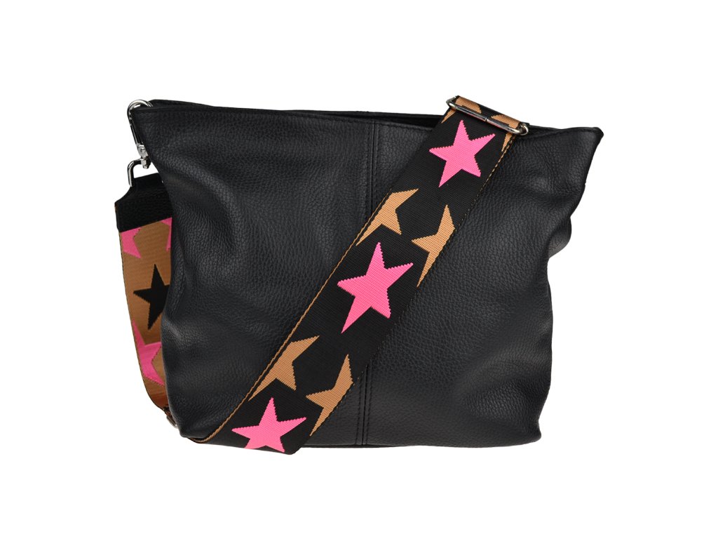 Praktická čierna kabelka uzatvárateľná na zips, nositeľná cez rameno alebo cross-body (krížom). Vo vnútri disponuje priečkou, ktorá zároveň slúži ako úložná priehradka so zipsom a na bočnej stene sa nachádza ďalšie zipsovacie vrecko. Hĺbka jej dna je 13 cm. Kabelka má naviac nastaviteľný popruh s maximálnou dĺžkou cca 120 cm.