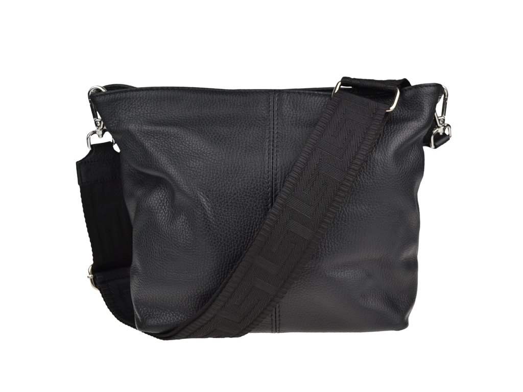 Praktická čierna kabelka uzatvárateľná na zips, nositeľná cez rameno alebo cross-body (krížom). Vo vnútri disponuje priečkou, ktorá zároveň slúži ako úložná priehradka so zipsom a na bočnej stene sa nachádza ďalšie zipsovacie vrecko. Hĺbka jej dna je 13 cm. Kabelka má naviac nastaviteľný popruh s maximálnou dĺžkou cca 120 cm.