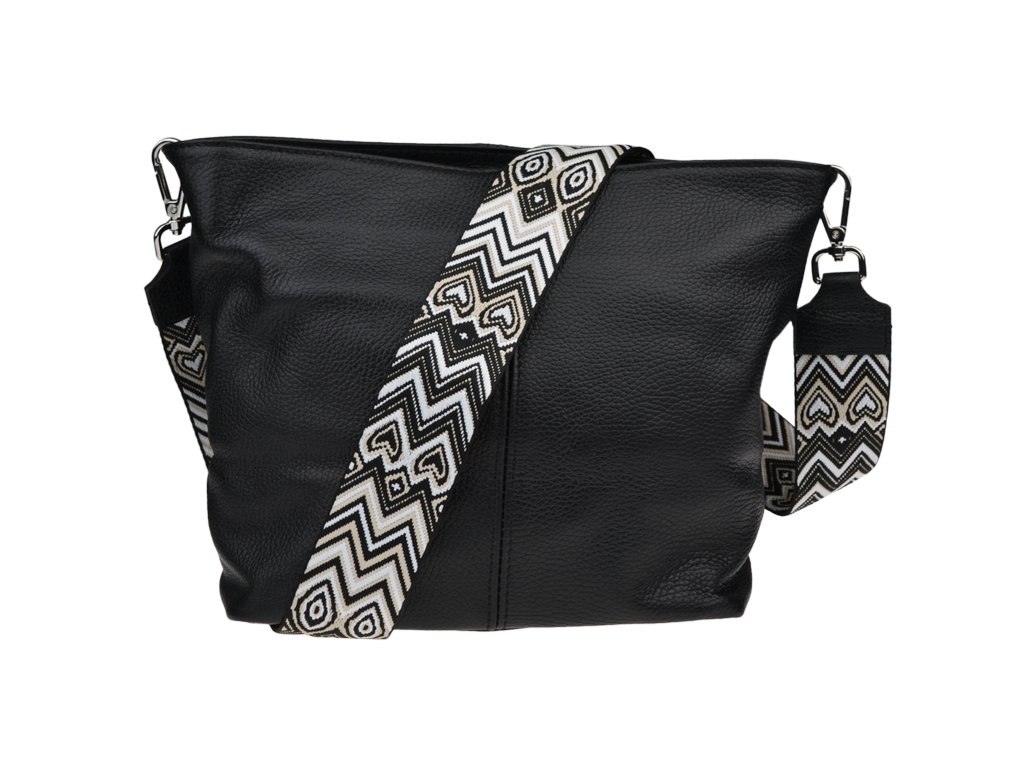 Praktická čierna kabelka uzatvárateľná na zips, nositeľná cez rameno alebo cross-body (krížom). Vo vnútri disponuje priečkou, ktorá zároveň slúži ako úložná priehradka so zipsom a na bočnej stene sa nachádza ďalšie zipsovacie vrecko. Hĺbka jej dna je 13 cm. Kabelka má naviac nastaviteľný popruh s maximálnou dĺžkou cca 120 cm.