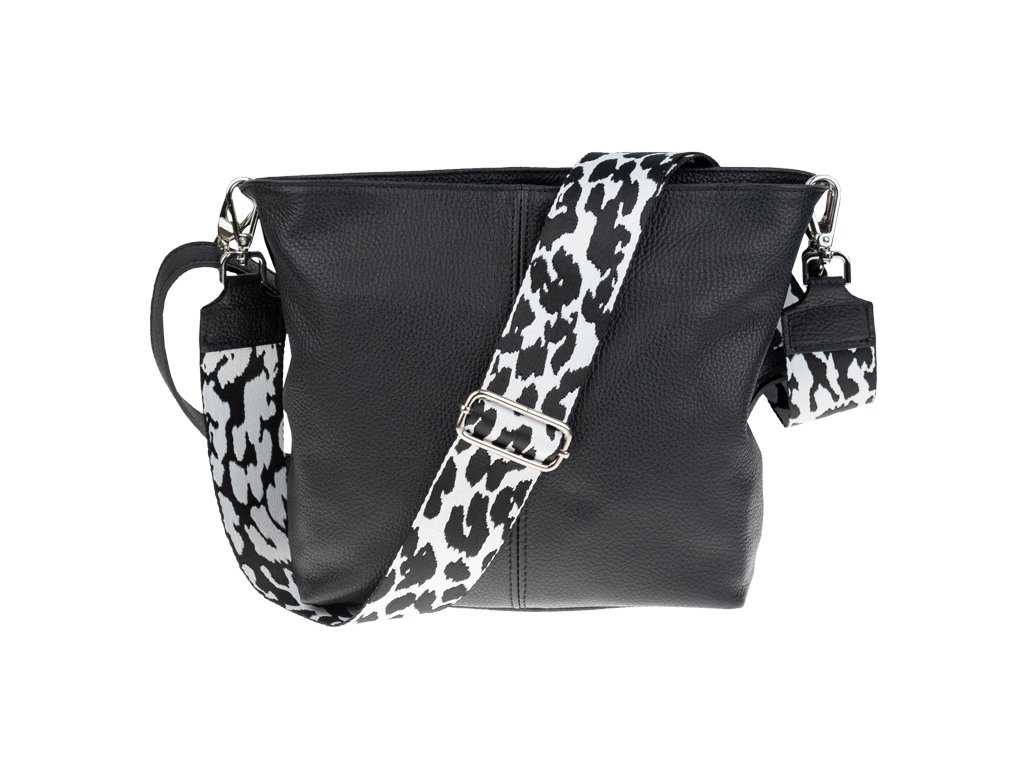 Praktická čierna kabelka uzatvárateľná na zips, nositeľná cez rameno alebo cross-body (krížom). Vo vnútri disponuje priečkou, ktorá zároveň slúži ako úložná priehradka so zipsom a na bočnej stene sa nachádza ďalšie zipsovacie vrecko. Hĺbka jej dna je 13 cm. Kabelka má naviac nastaviteľný popruh s maximálnou dĺžkou cca 120 cm.
