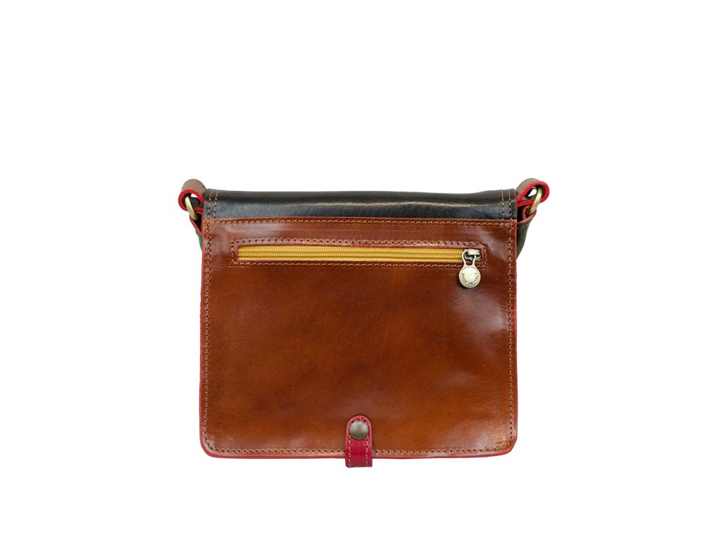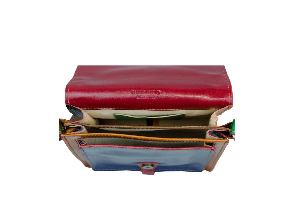 Nádherná farebná kabelka vo vintage štýle, uzatvárateľná patentom. Kabelka je vhodná na nosenie cez rameno alebo crossbody (krížom). Vnútro kabelky disponuje tremi priehradkami a malú priehradku na mobil či kľúče.