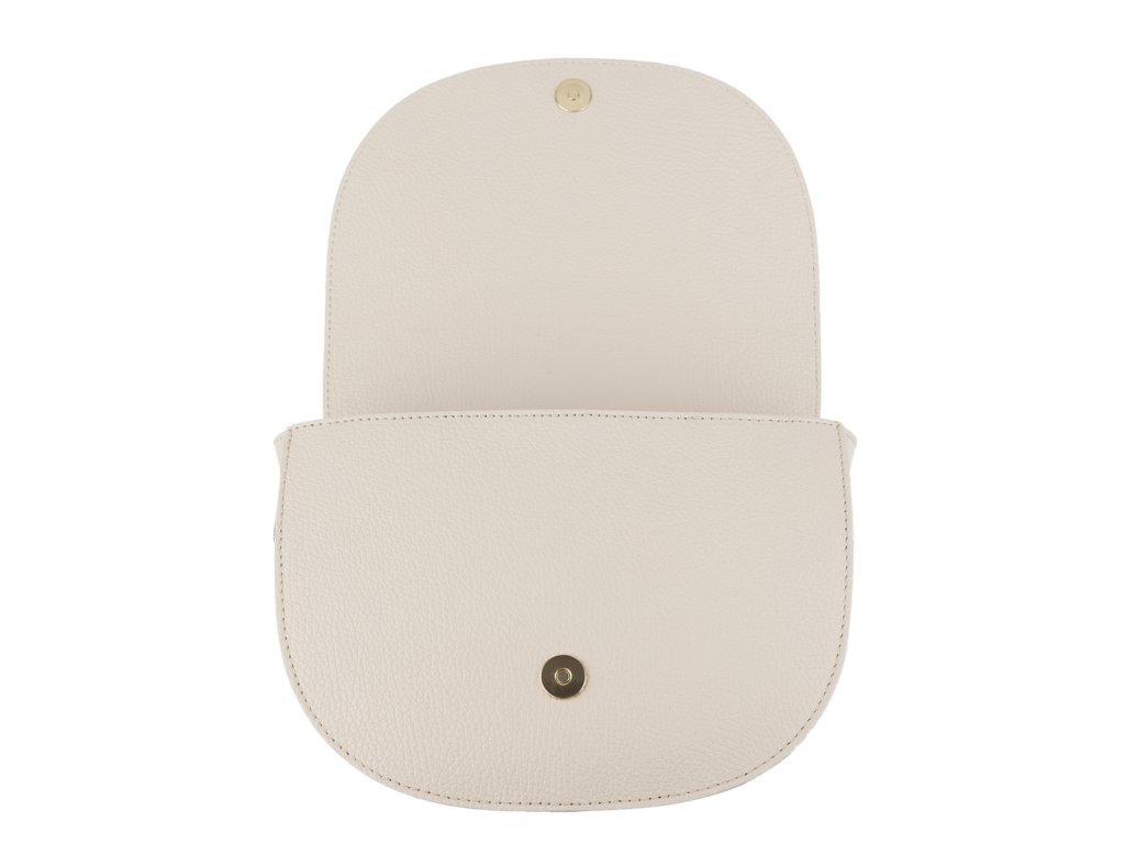Béžová kabelka nositeľná cez rameno či cross-body (krížom). Táto kožená kabelka je uzatvárateľná na patentku a vnútri nájdeme priehradku na zips.