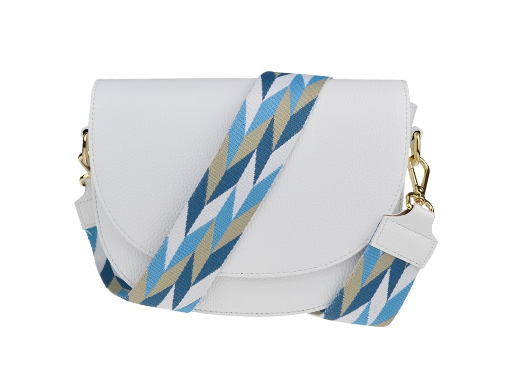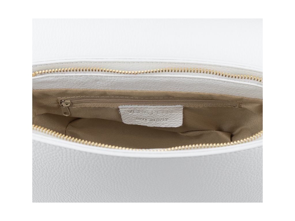 Biela kabelka nositeľná cez rameno či cross-body (krížom). Táto kožená kabelka je uzatvárateľná na patentku a vnútri nájdeme priehradku na zips. Kabelka má nastaviteľný popruh s maximálnou dĺžkou cca 140 cm.