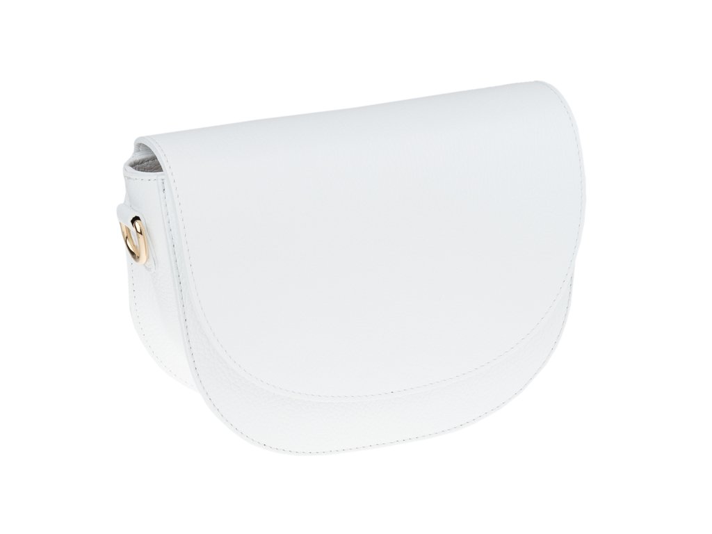 Biela kabelka nositeľná cez rameno či cross-body (krížom). Táto kožená kabelka je uzatvárateľná na patentku a vnútri nájdeme priehradku na zips. Kabelka má nastaviteľný popruh s maximálnou dĺžkou cca 140 cm.